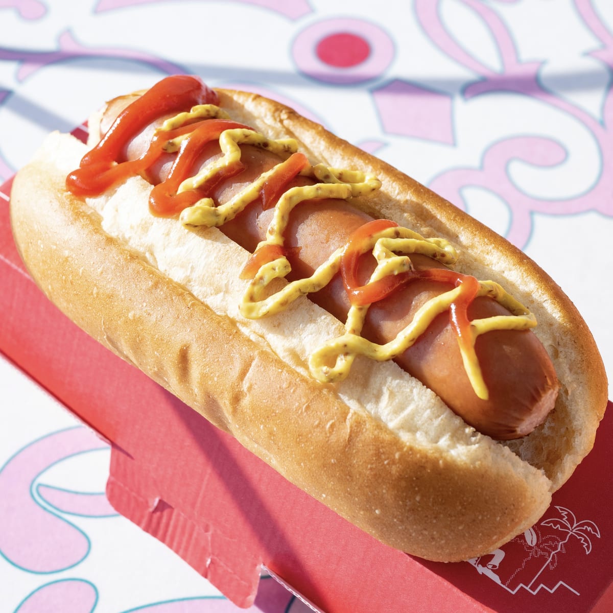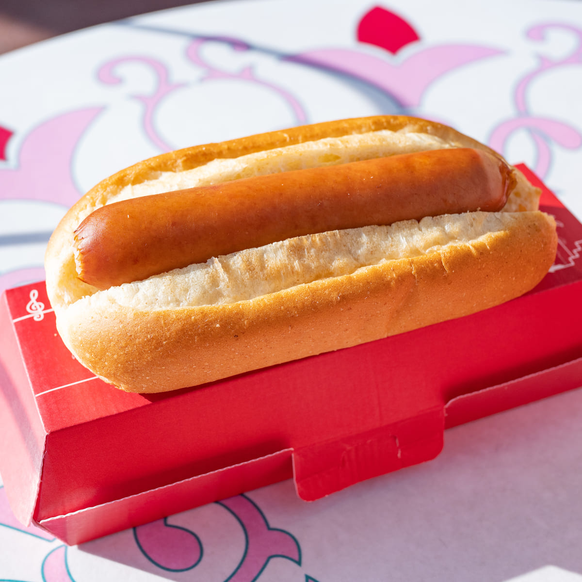 赤いパッケージに入ったシンプルなホットドッグ。