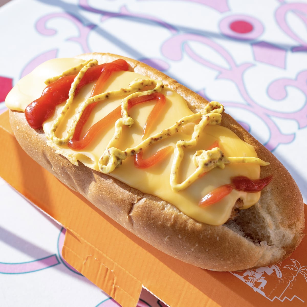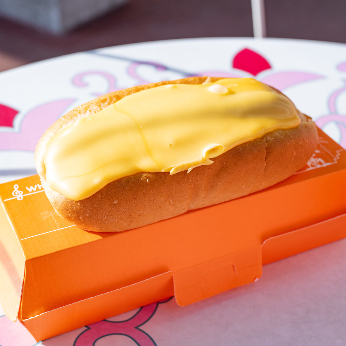 オレンジのパッケージに入ったチーズドッグ。