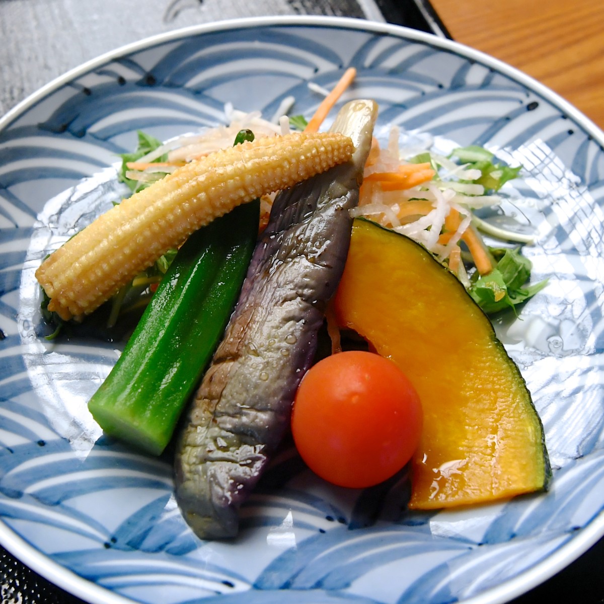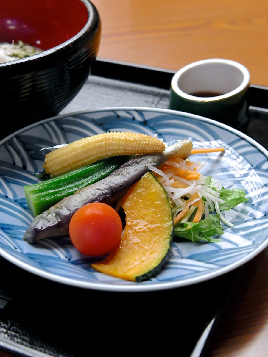 人参と大根、水菜、ヤングコーン、オクラ、茄子、ミニトマト、かぼちゃなどの夏野菜がしっかりといただけるサラダ付き。