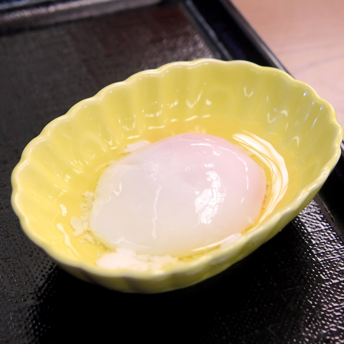 おうどんのトッピングの他に、別皿で半熟玉子が付いています。