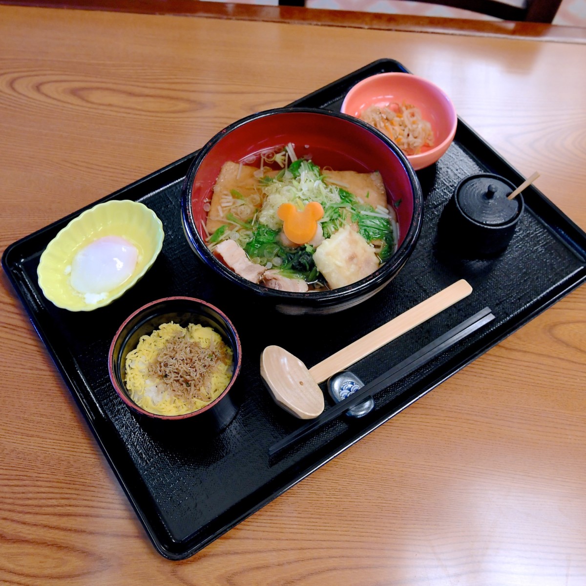 豚肉と焼餅のきつね五目うどん、半熟玉子、ちりめん山椒ご飯、小鉢のセット