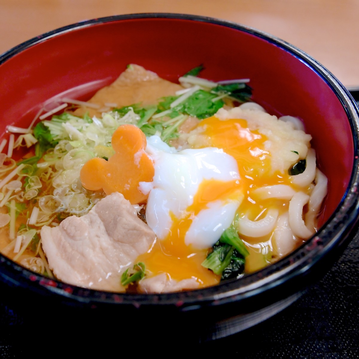 豚の角煮、焼餅、きつね(油揚げ)、ミッキーシェイプのにんじん、水菜、ほうれん草、ネギ、大根おろしとトッピングの種類も量も豊富!