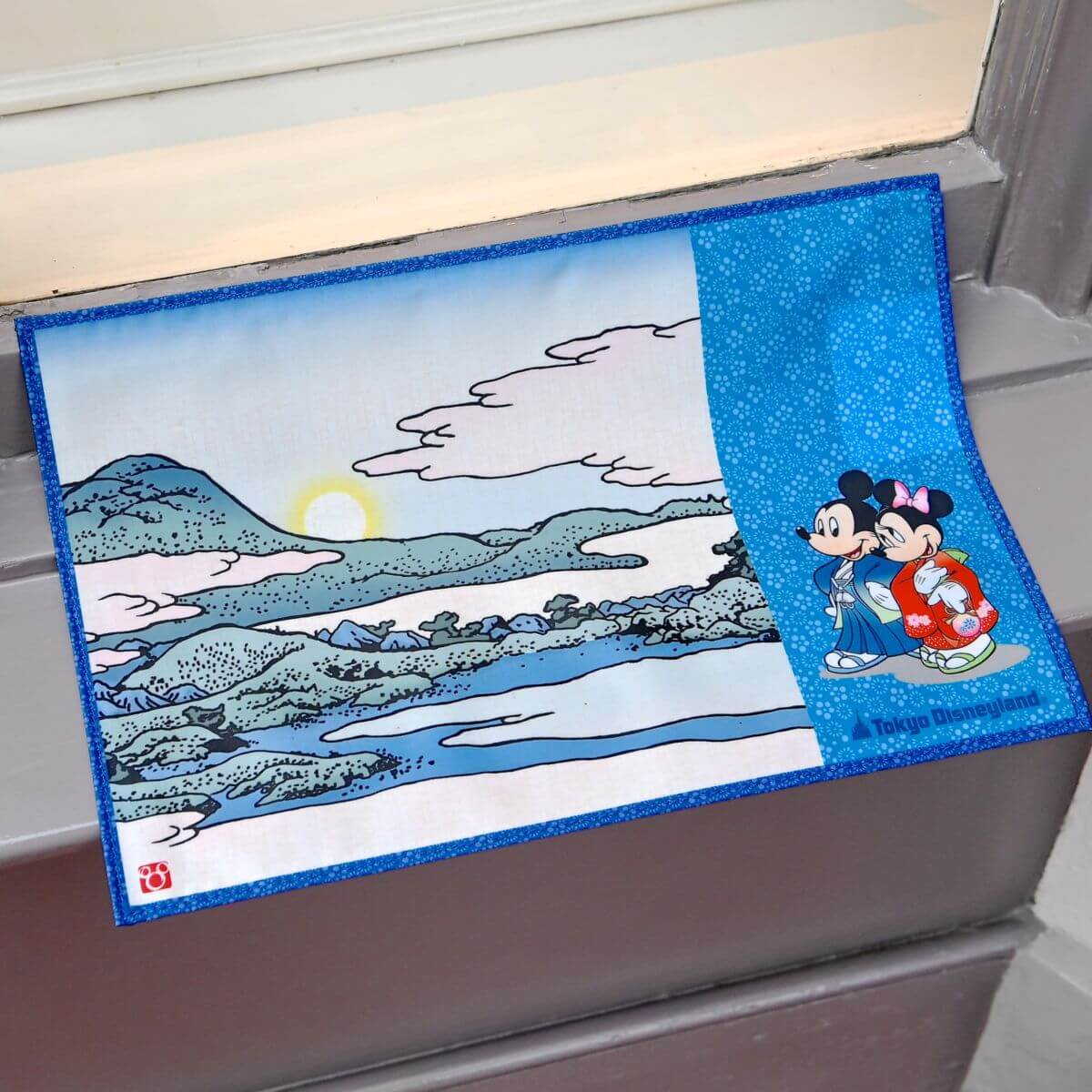 和装のミッキーマウスとミニーマウス、「れすとらん北齋」らしい絵画がデザインされた和なランチョンマットです。