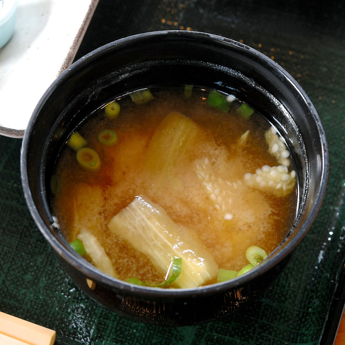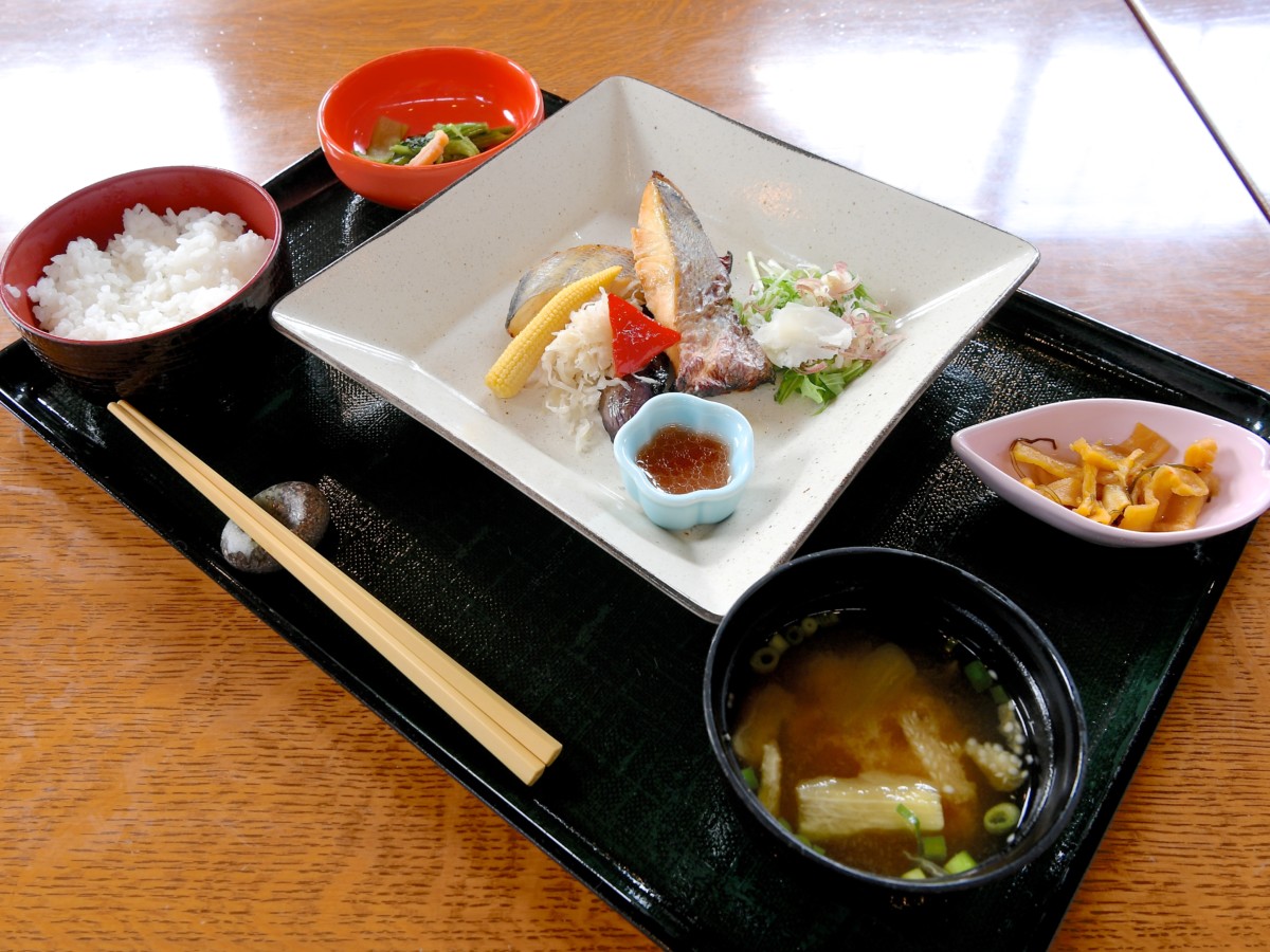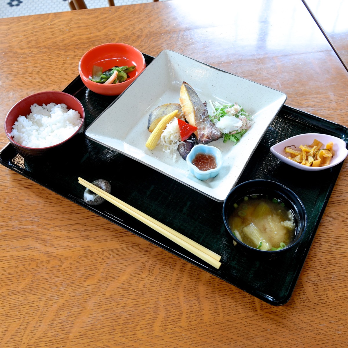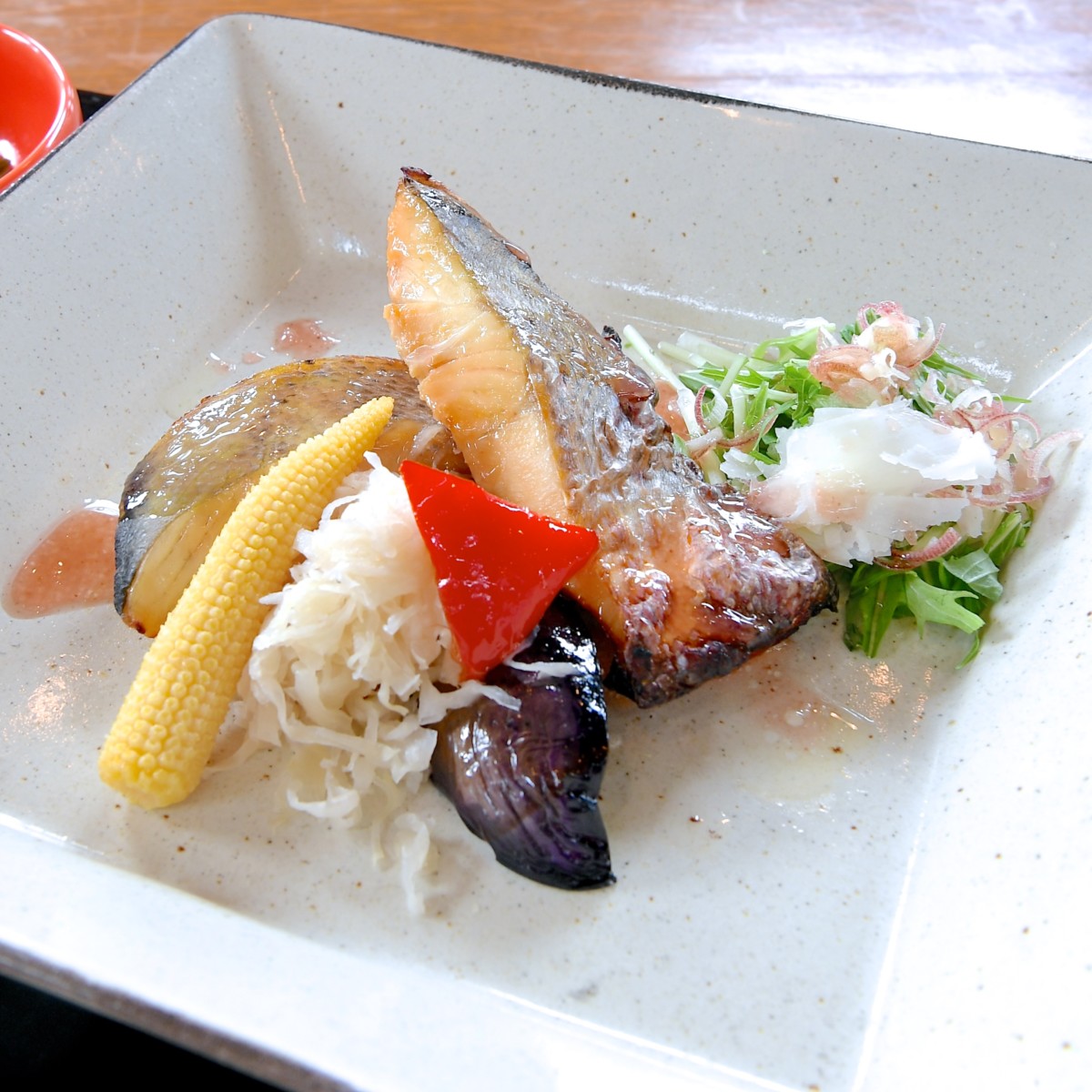 鱸(スズキ)の味噌漬け、ご飯、赤だし、小鉢、香の物のセット