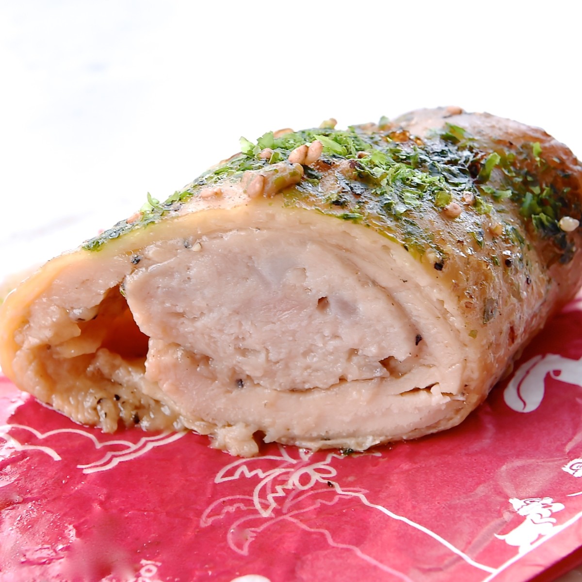 やわらかいチキンを更にチキンの皮で巻いた鶏肉尽くしの熱々肉汁たっぷりのメニュー!