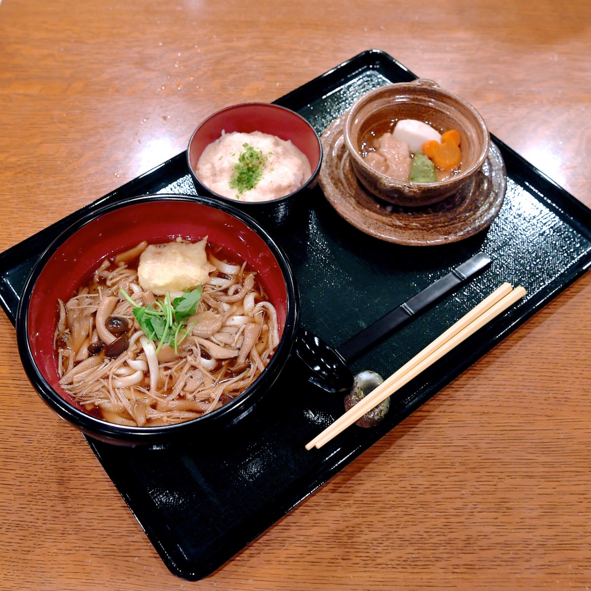 キノコのあんかけうどん(揚げもち入り)、鶏肉と海老芋とアボカドの炊き合わせ、とろろご飯のセット。