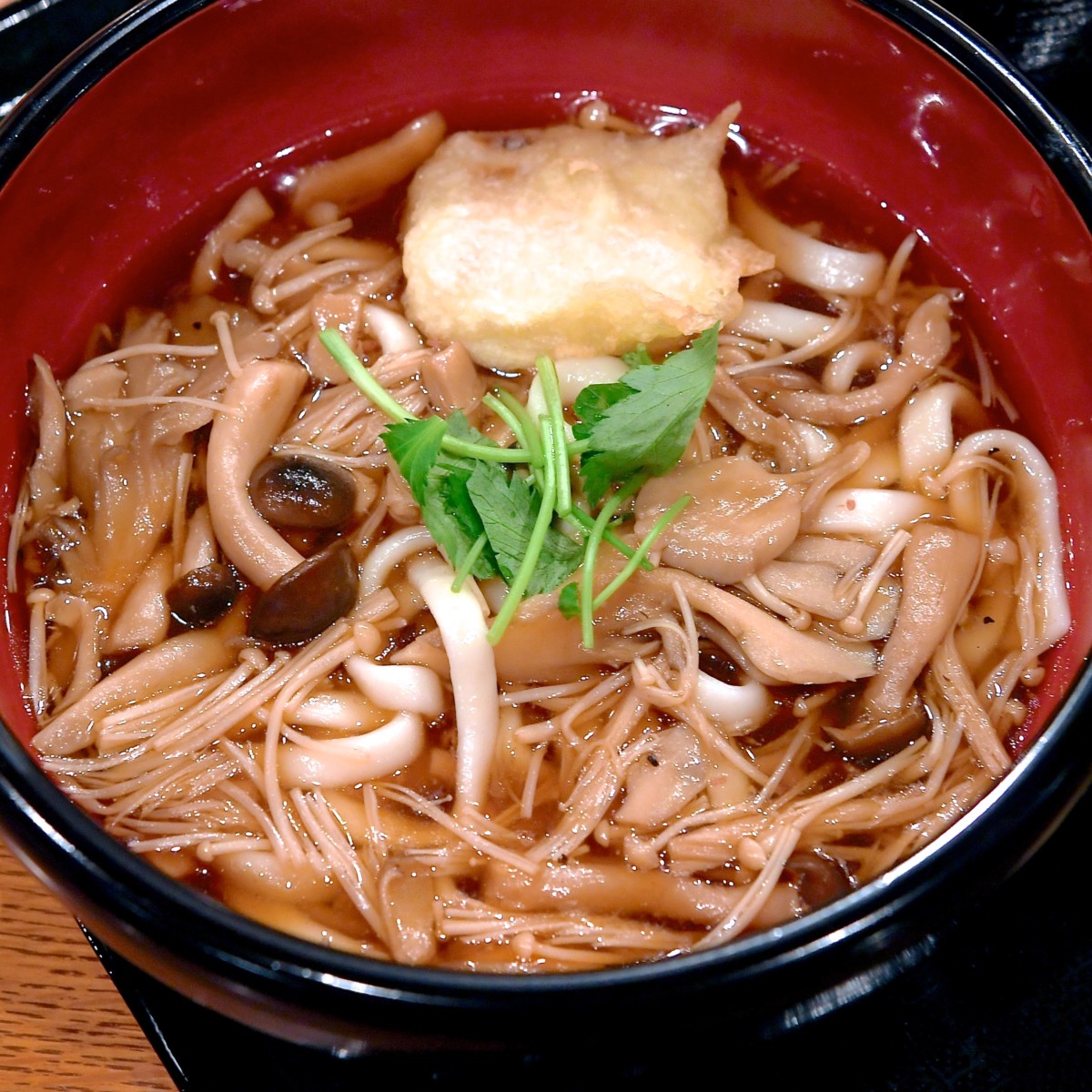 たっぷりのきのこがトッピングされた熱々のおうどん。