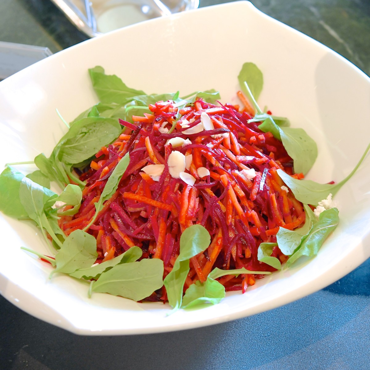 クリスマスらしい彩りのルッコラとビーツのサラダ。