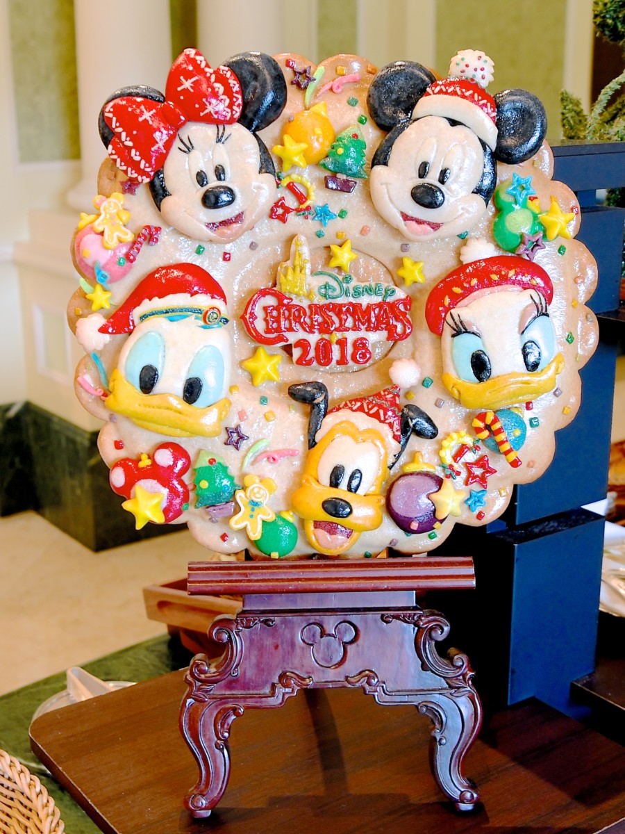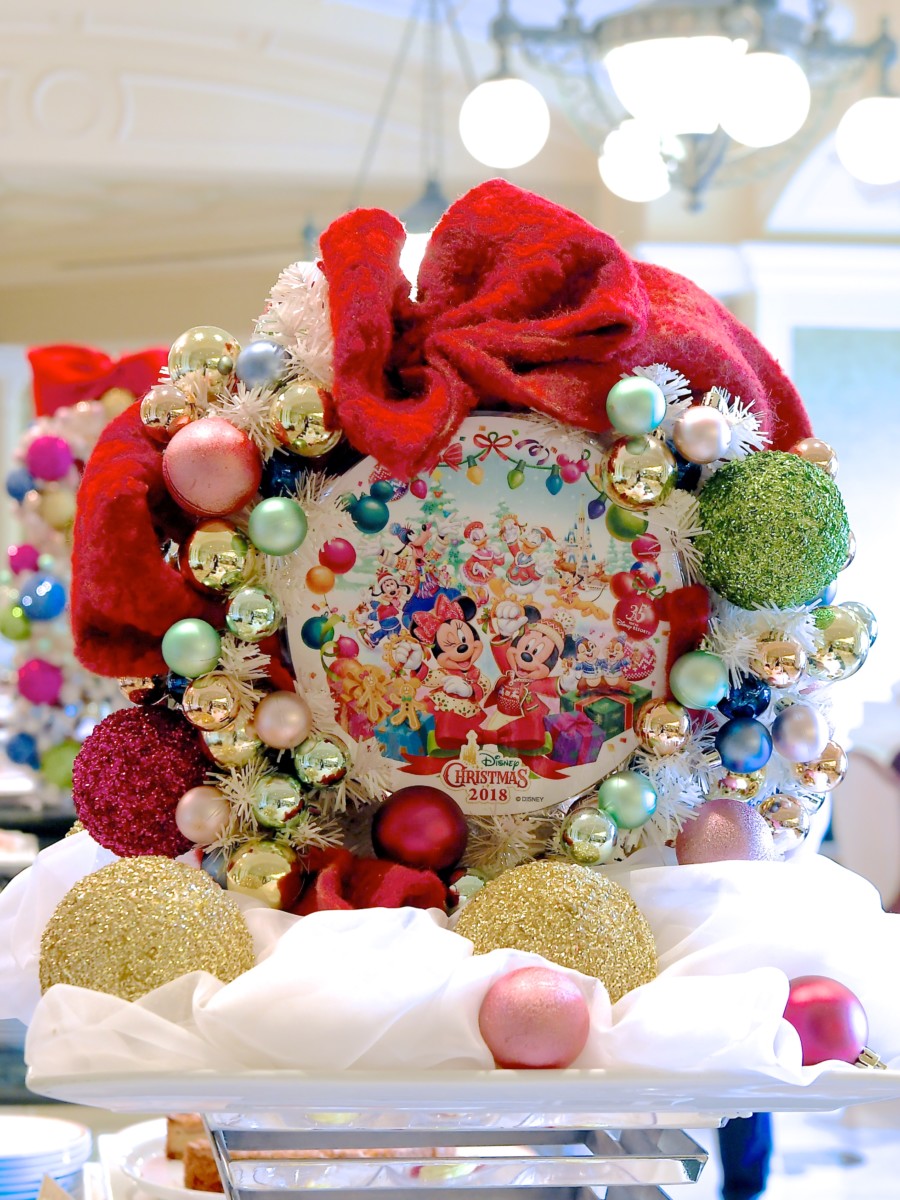 パンコーナーにはクリスマスコスチュームのミッキー、ミニー、ドナルド、デイジー、プルートのリース風デコレーション。