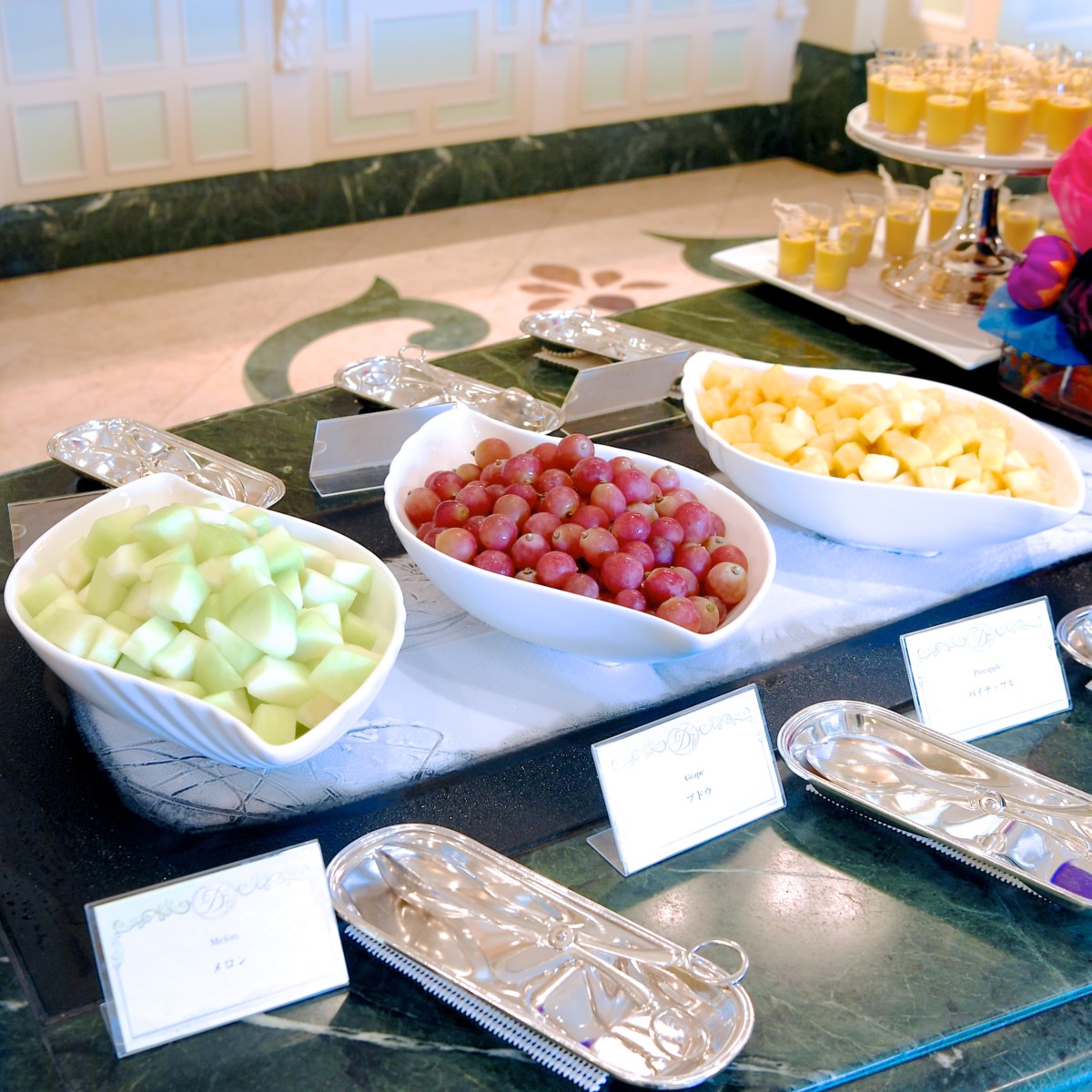 フルーツはメロン、パイナップル、ブドウです。