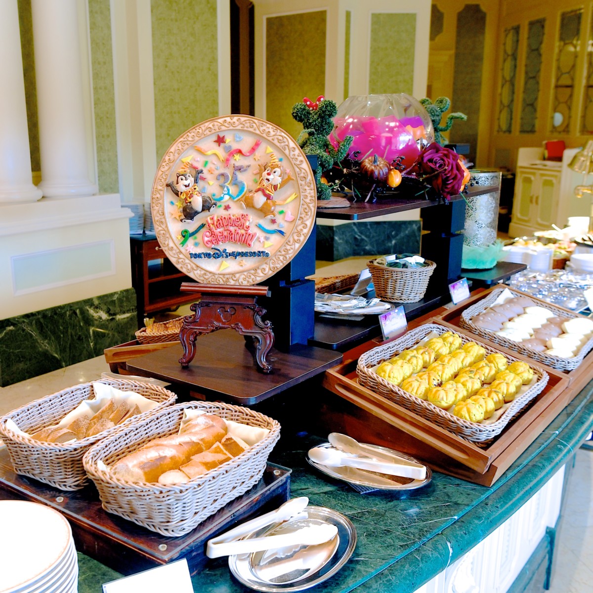 ブッフェと一緒に東京ディズニーランドの新パレード「スプーキー“Boo!”パレード」のミッキーたちやディズニー・ヴィランズ風、東京ディズニーリゾート35周年のデコレーションも楽しめます!