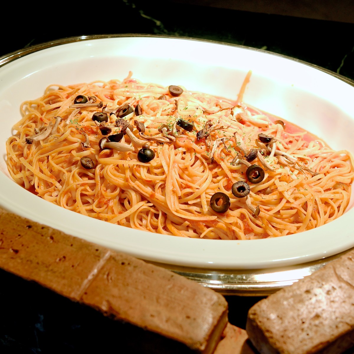 もちもち食感のリングイネはきのこやトマトたっぷりなボスカオーラ風。