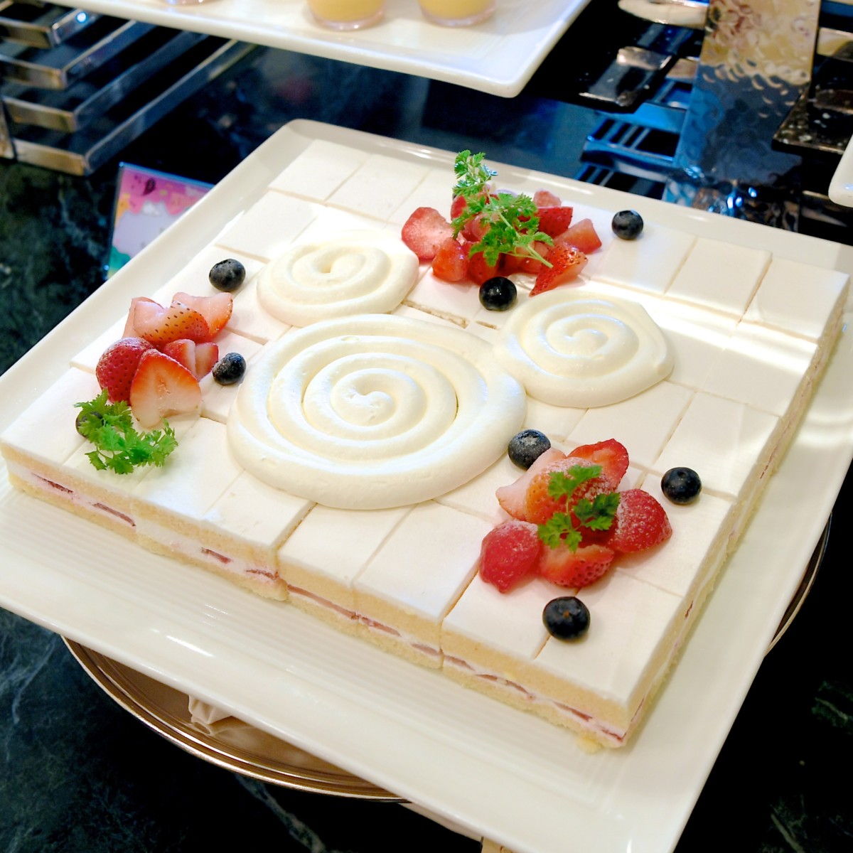 ミッキーマークがデコレーションされたいちごたっぷりショートケーキ。