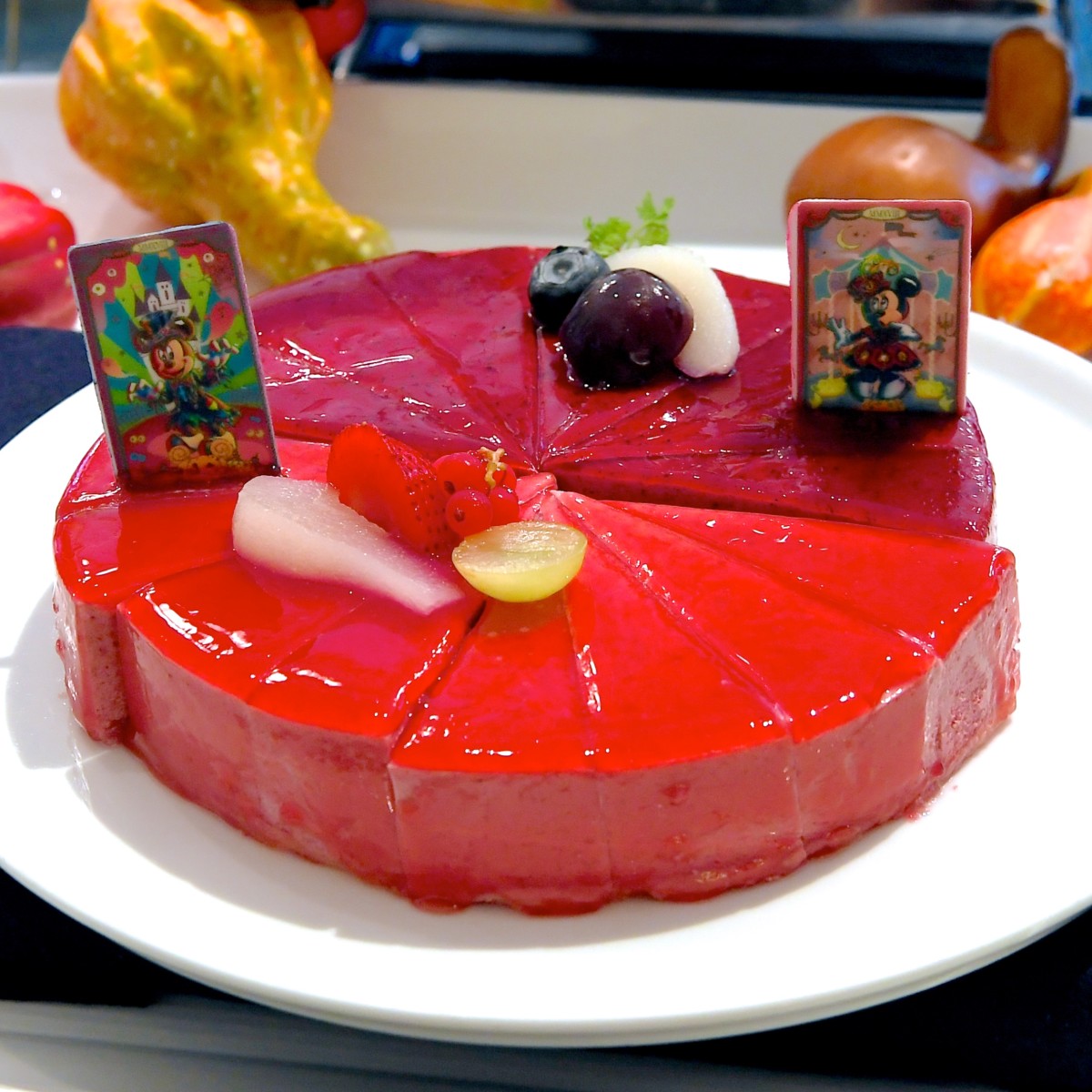 ミッキー、ミニーのタロット風砂糖菓子がトッピングされた甘酸っぱいムースケーキ。