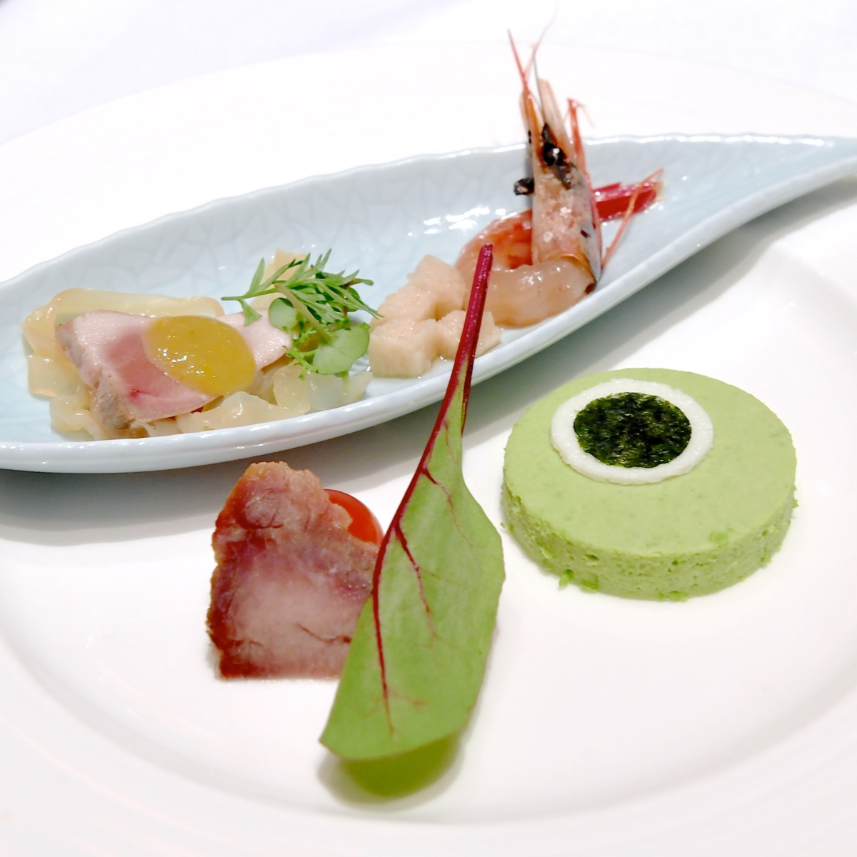 上からクラゲの冷菜とイナダ、長芋と甘エビの紹興酒づけ、チャーシューとミニトマト、そしてマイク・ワゾウスキをイメージしたグリーンピースよせです☆