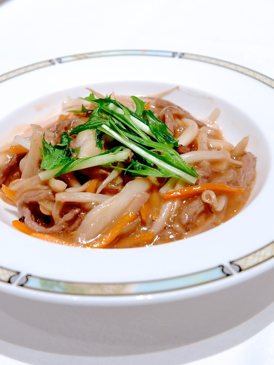 たっぷりの牛肉とシャキシャキな野菜の食感が楽しめるあんかけ焼きそば。