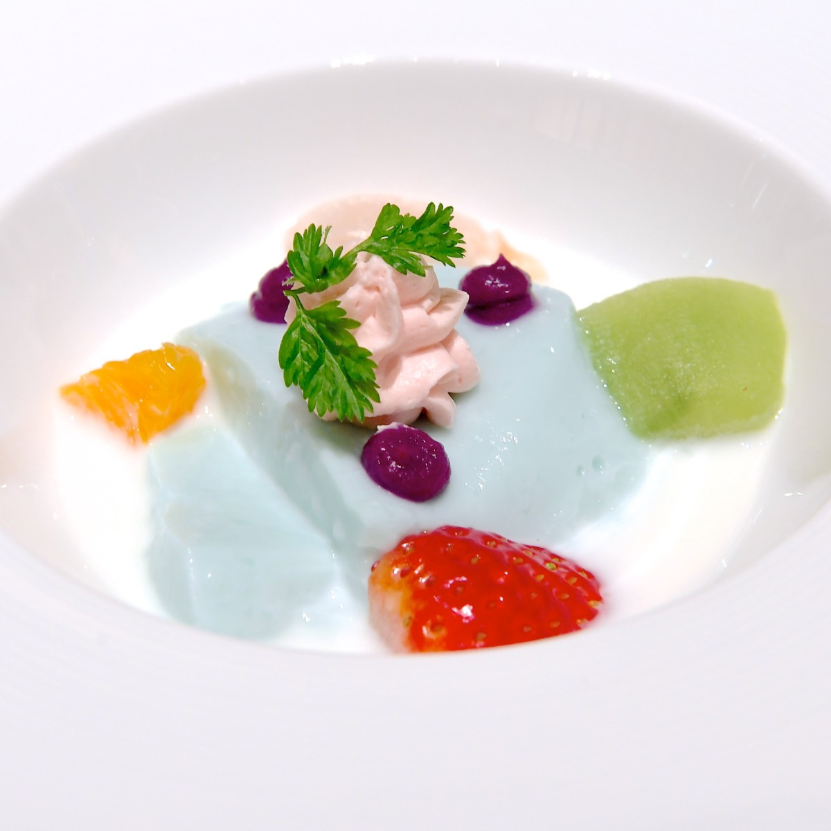 ココナッツが練り込まれたブルーのプリンにはいちごのホイップも☆