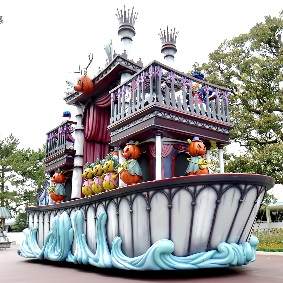黒い木馬やかぼちゃのティーカップが回るファンタジーランドをイメージしたフロート