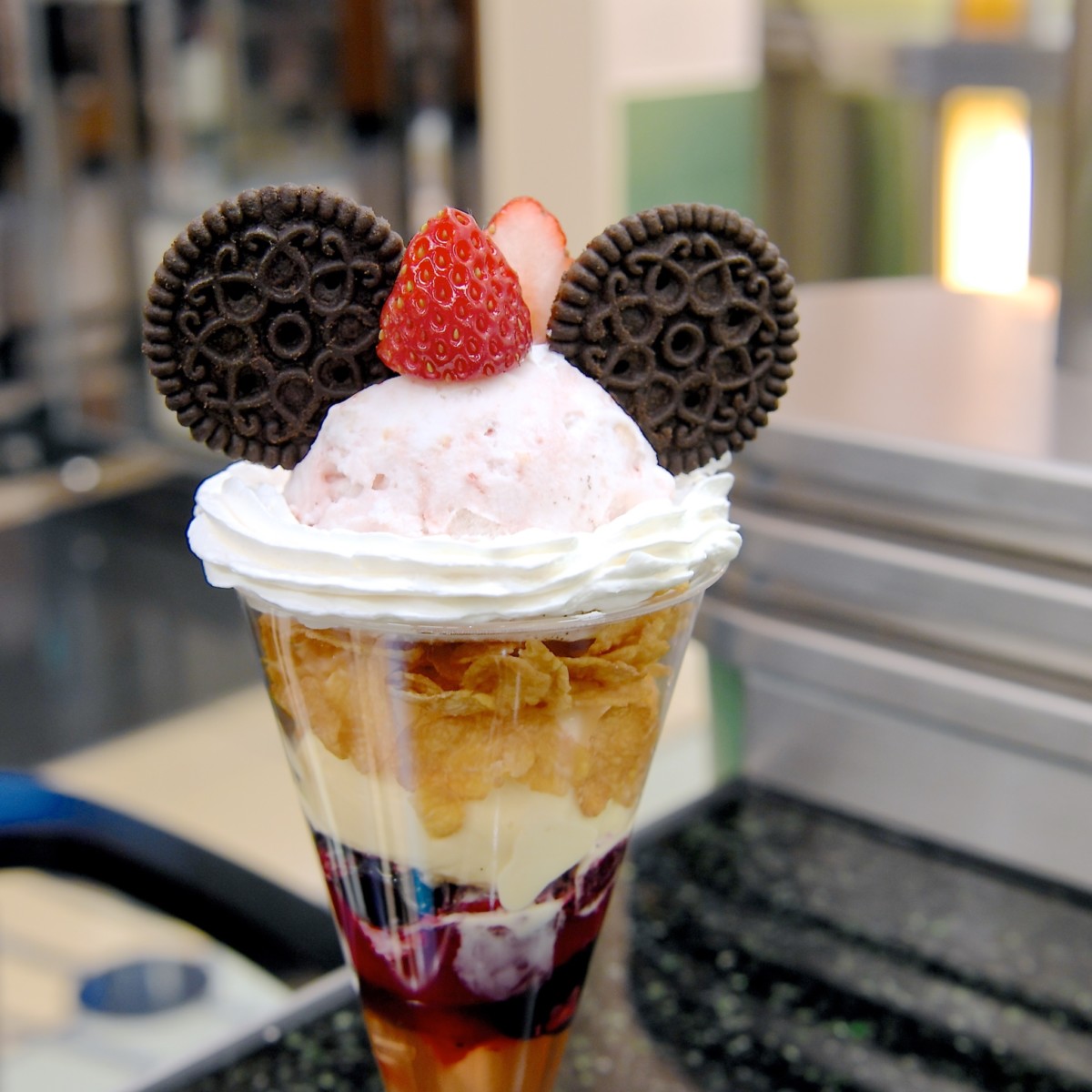 ストロベリーショートケーキ風味のアイスクリームとココアクッキー、いちごでかわいいミニーちゃんを表現しています☆