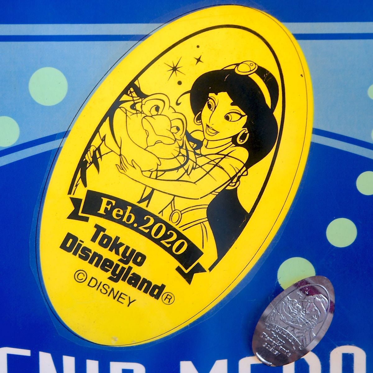 『アラジン』のディズニープリンセス“ジャスミン”とペットのトラのラジャーがデザインされたスーベニアメダル。