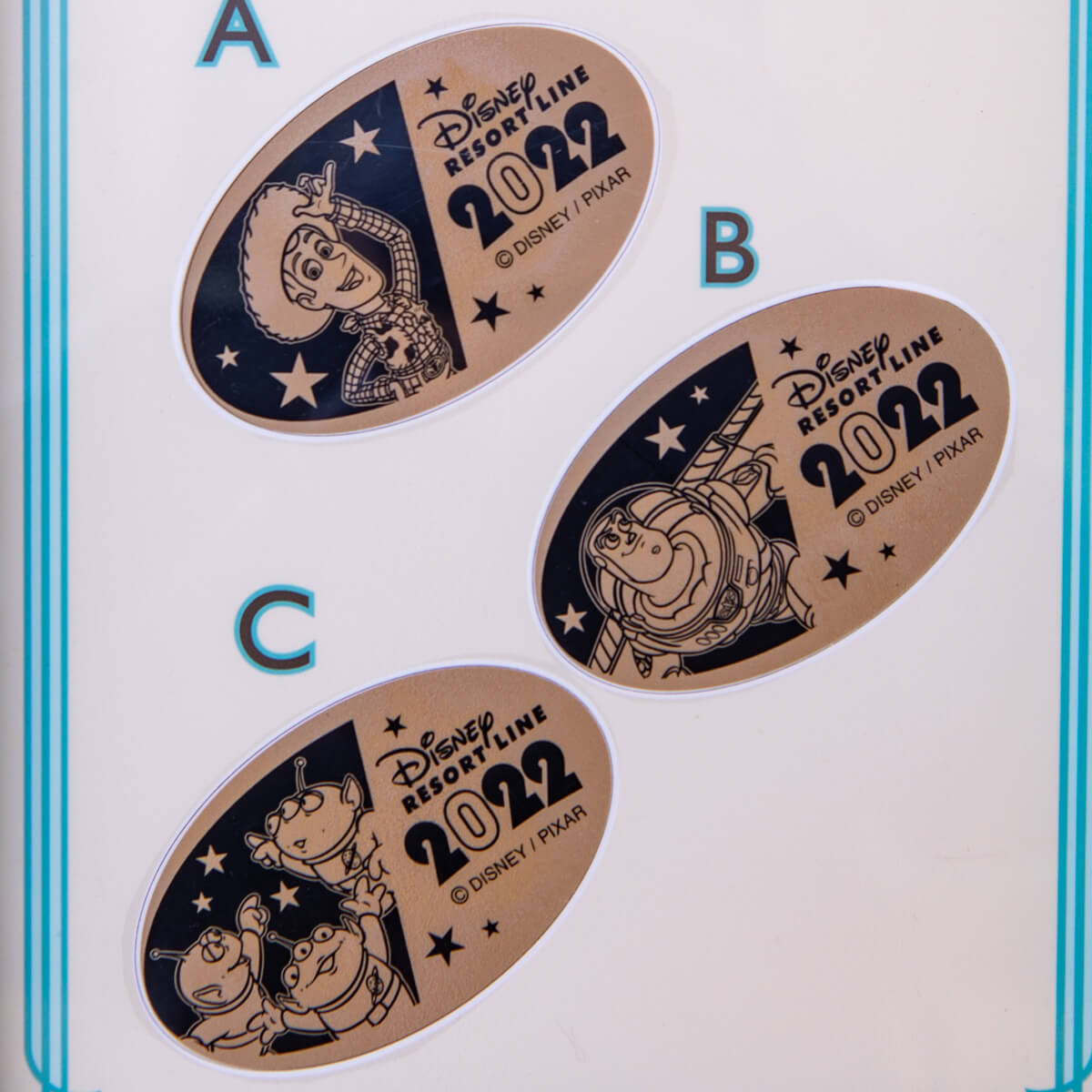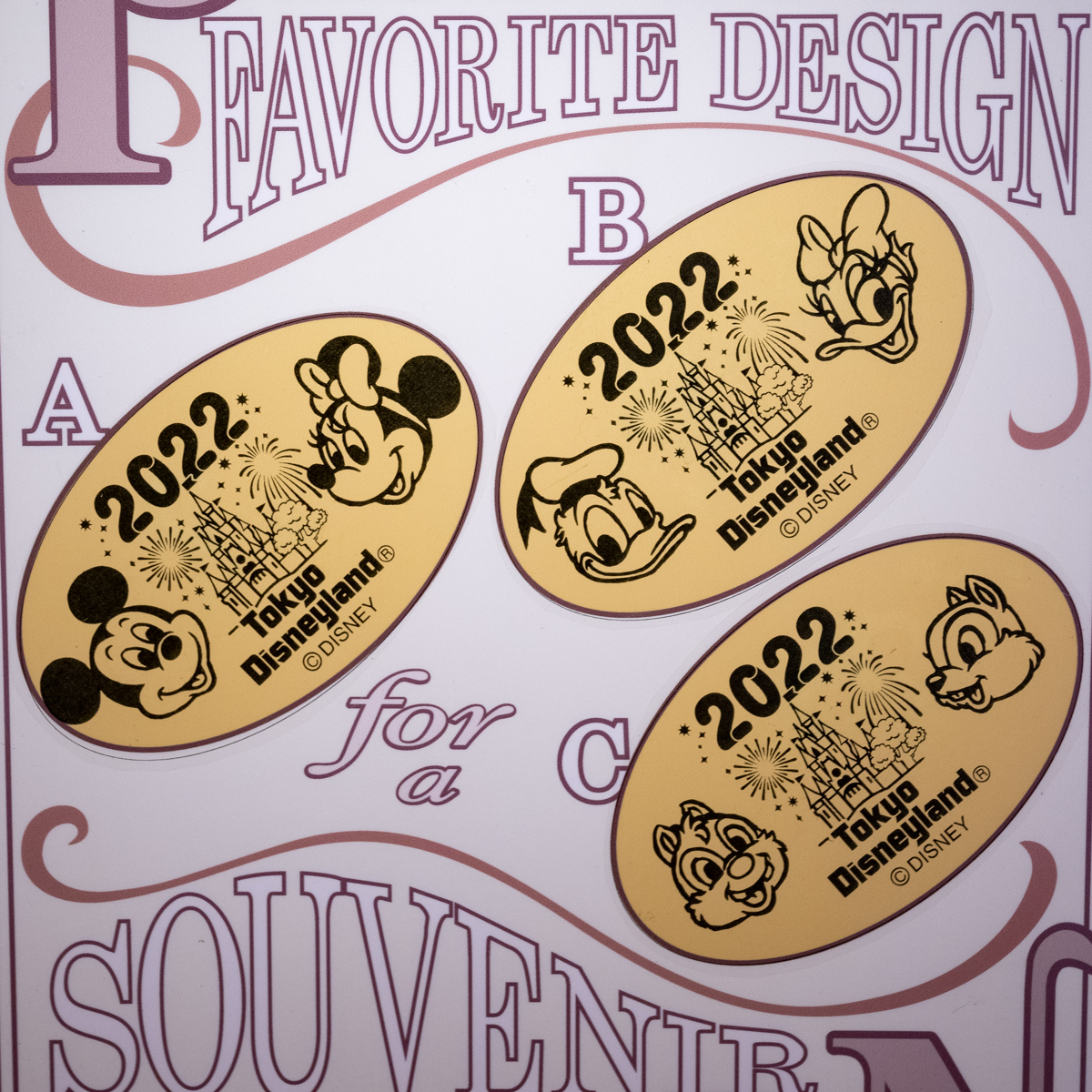 東京ディズニーリゾート・オフィシャルホテル群へのアクセスに便利なベイサイド・ステーションで販売されている3種類のスーベニアメダル。