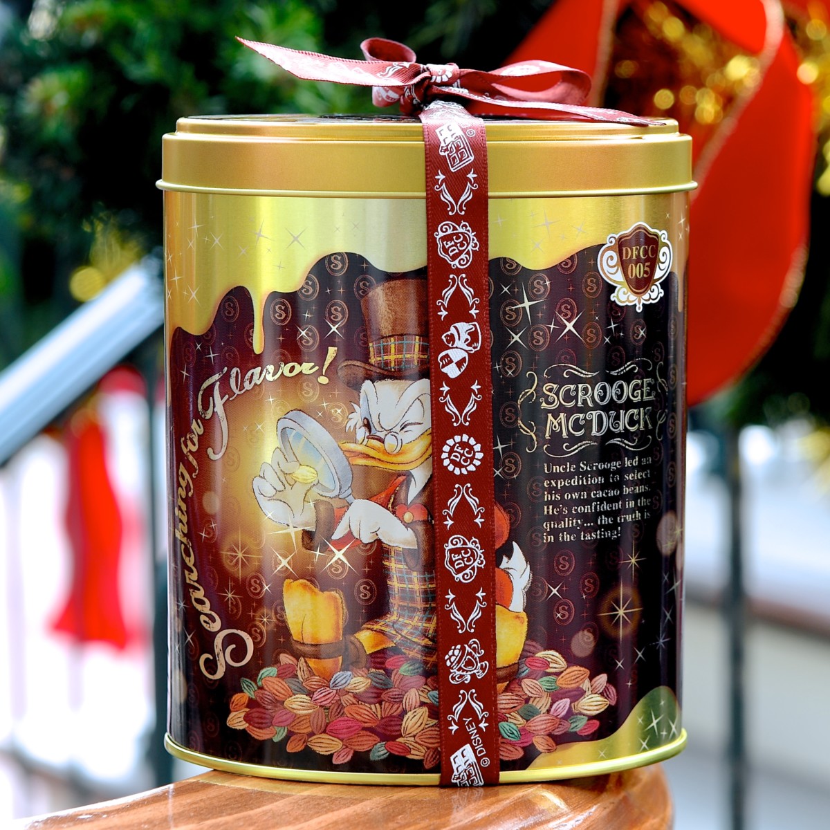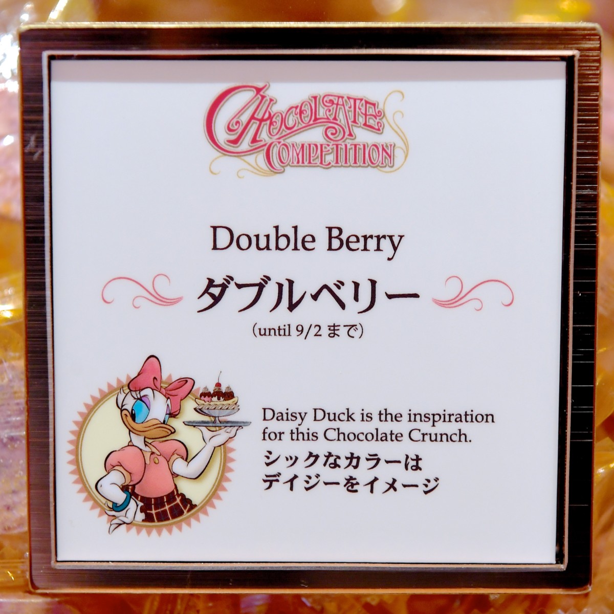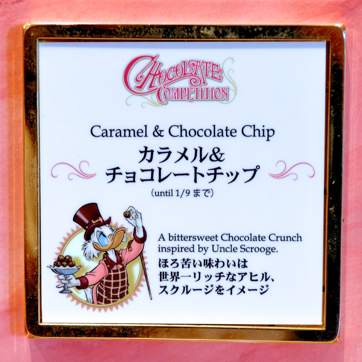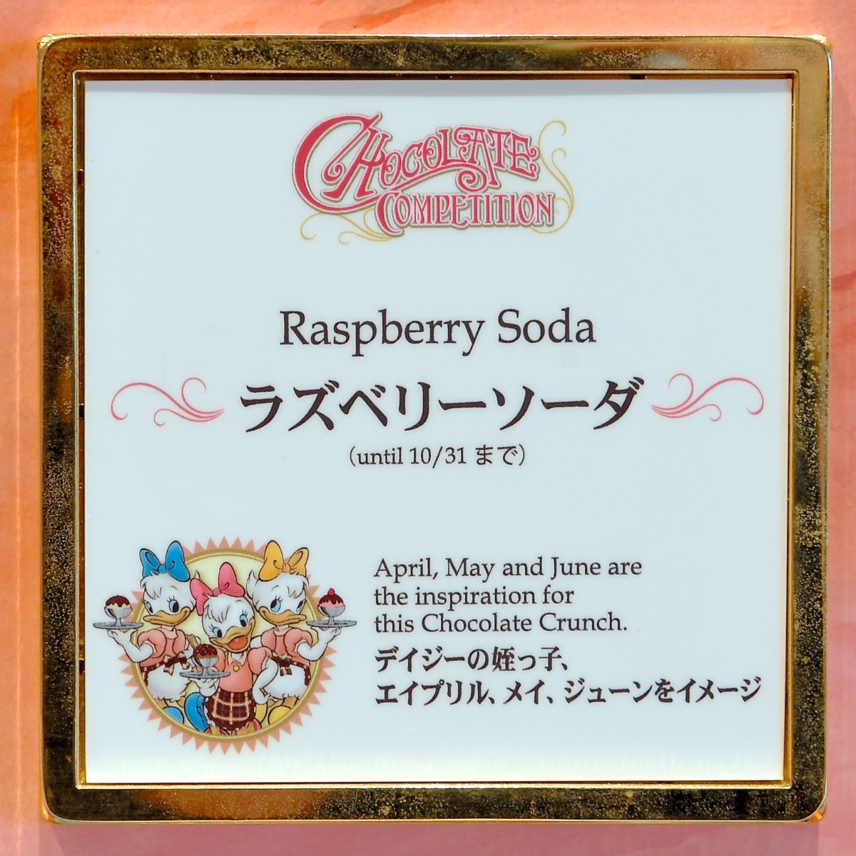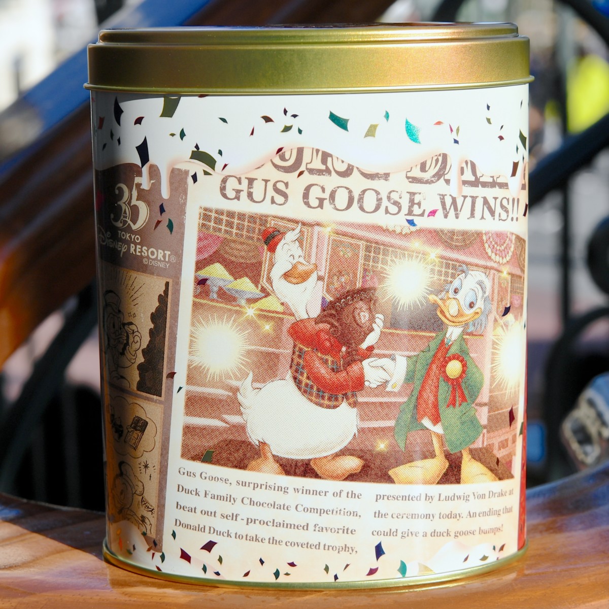 バックにはチョコレートコンテストに優勝したドナルドのいとこ“ガス・グース”が“ルードヴィヒ・フォン・ドレイク教授”からトロフィーををもらっている姿がデザインされています。