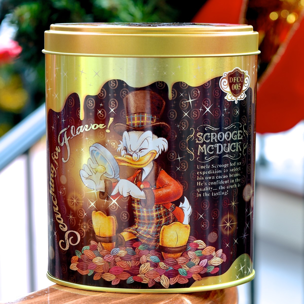 スクルージおじさんの缶はゴールドカラーに$マーク総柄デザイン。