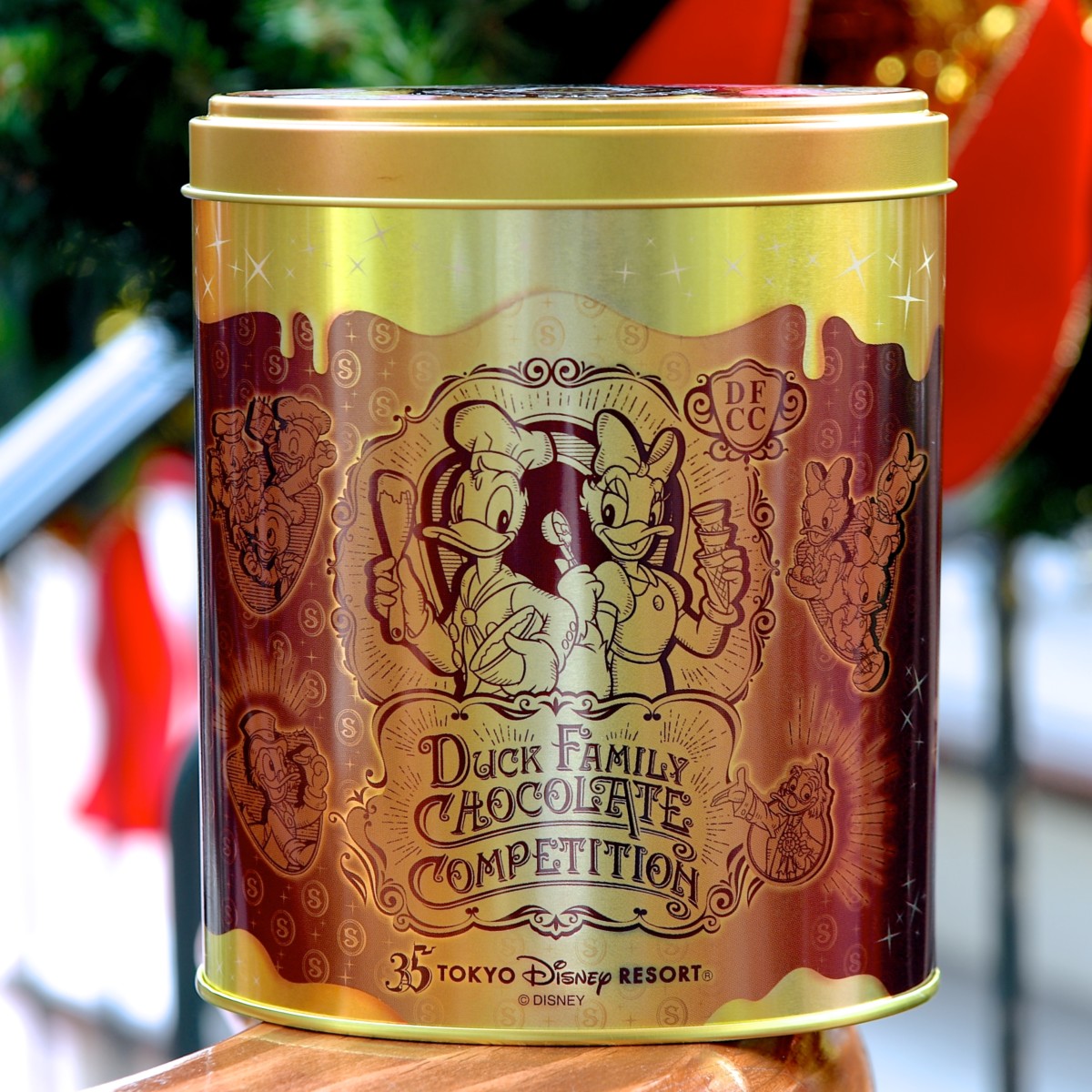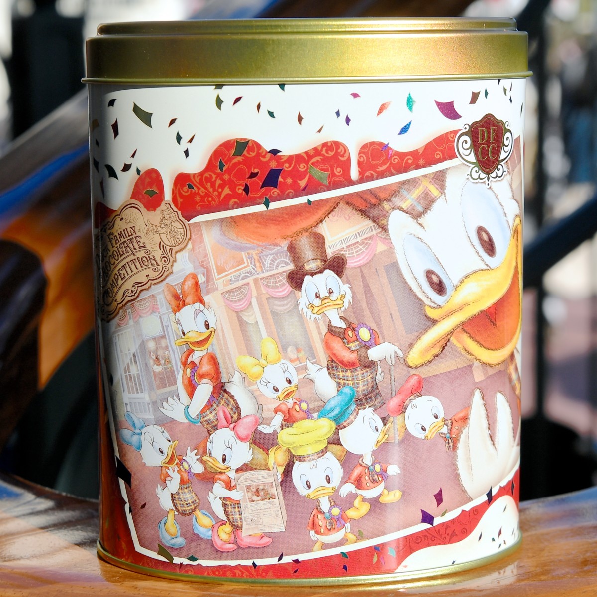 赤いパティシエコスチュームのドナルドが大きくデザインされたかわいい缶です。