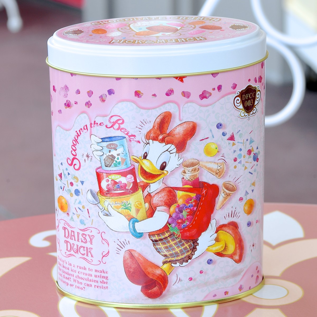 エプロン姿のデイジーが大きくデザインされたピンク色の缶パッケージ。
