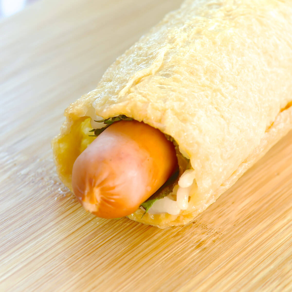 ソーセージをごはんといなりで巻いた初体験の味が楽しめます。