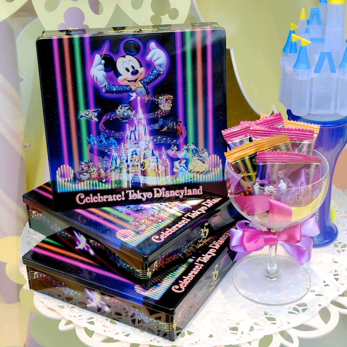 Celebrate!Tokyo Disneylandのメインアートがデザインされたスクエア型の缶に入ったチョコレートのお土産。