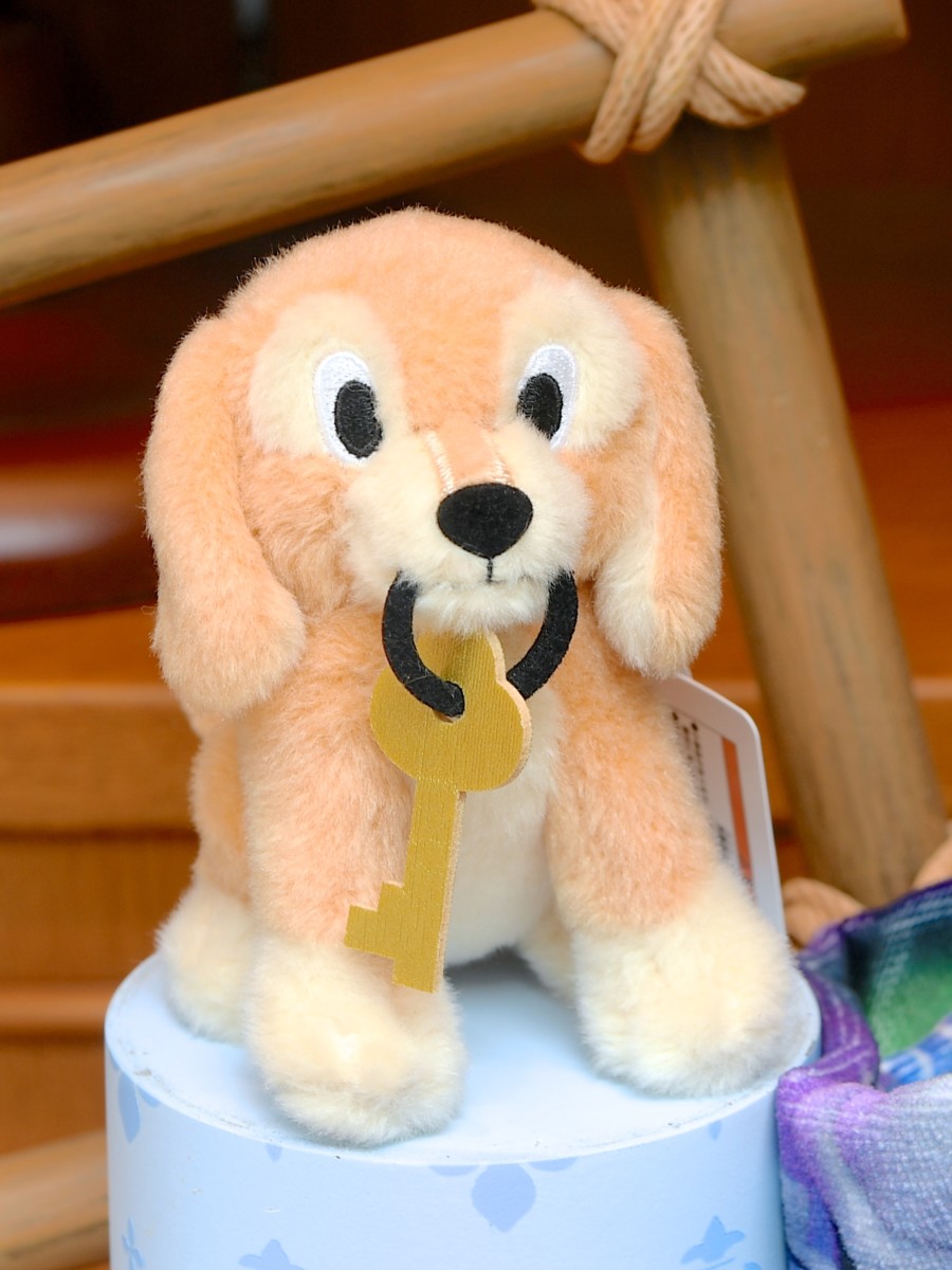 アトラクション「カリブの海賊」に登場する鍵をくわえた犬(鍵犬)のぬいぐるみバッジ。