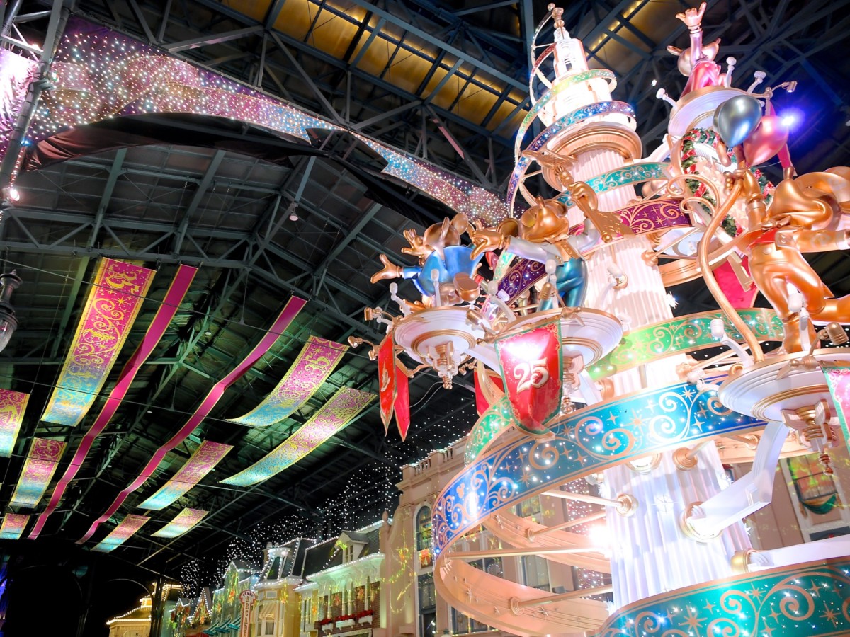 中央で輝くセレブレーションタワーもクリスマスカラーに彩られ、ワールドバザール全体がクリスマスらしい素敵な雰囲気に包まれます。