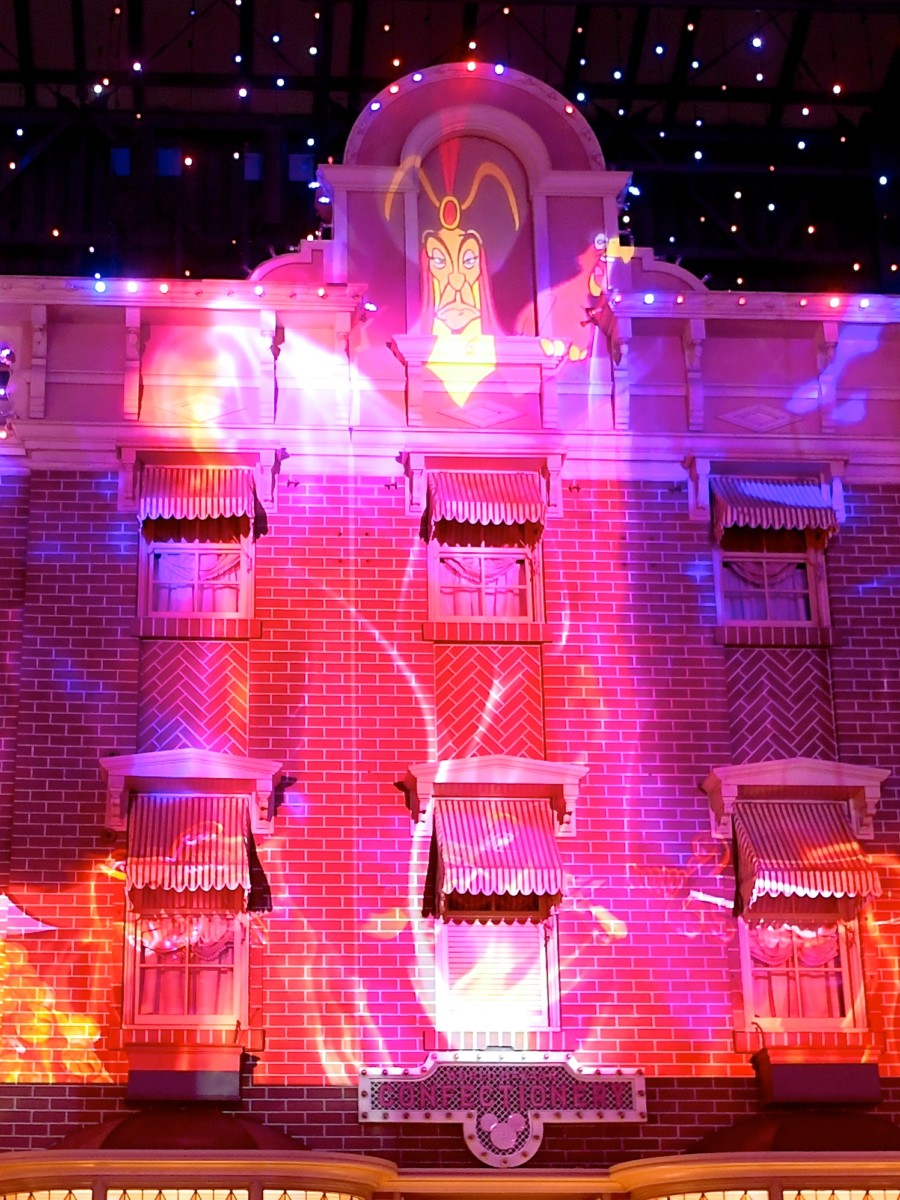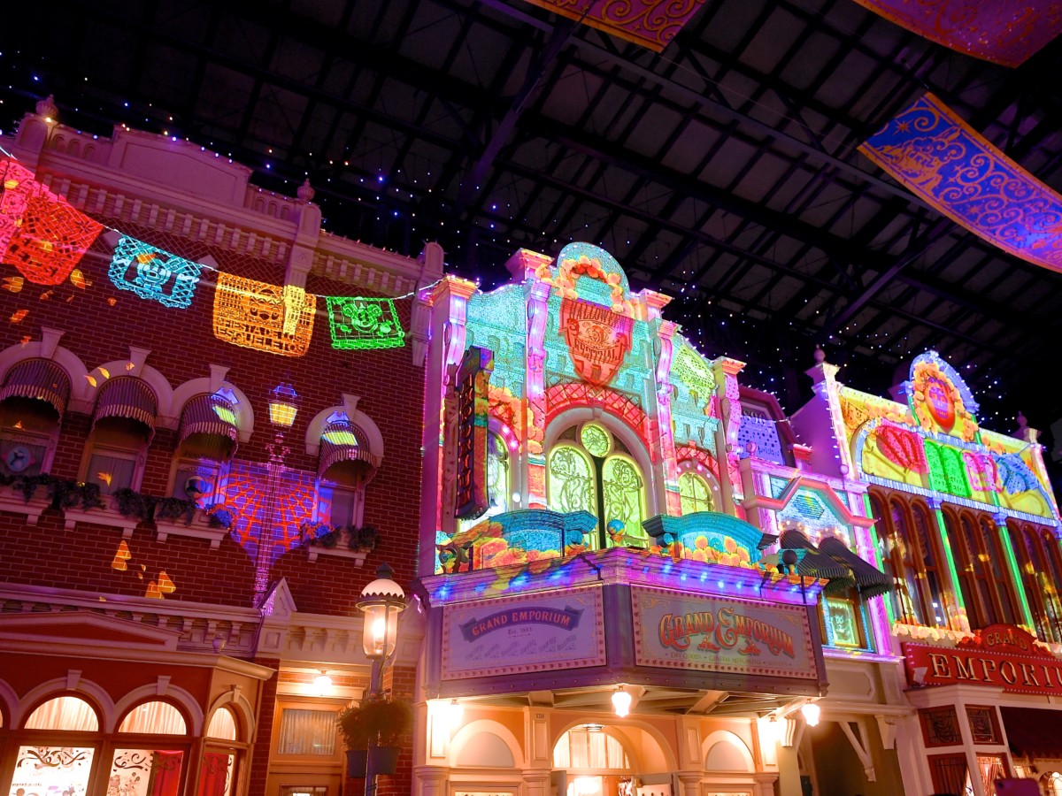 ワールドバザールの「セレブレーションストリート」で夜に公演されているナイトエンターテイメントがディズニー・ハロウィーン期間限定でゴーストやスケルトン、かぼちゃ、ディズニー・ヴィランズたちが映し出される特別バージョンで公演!