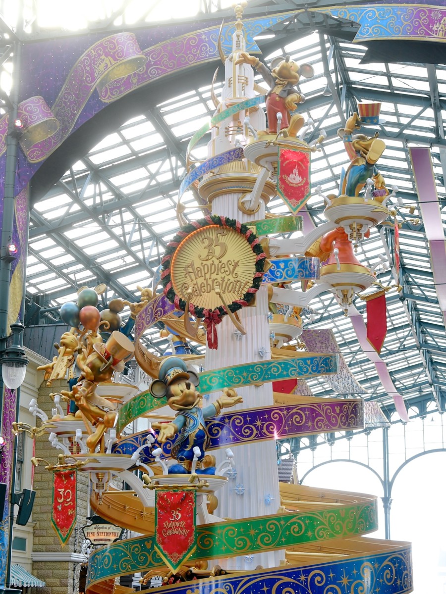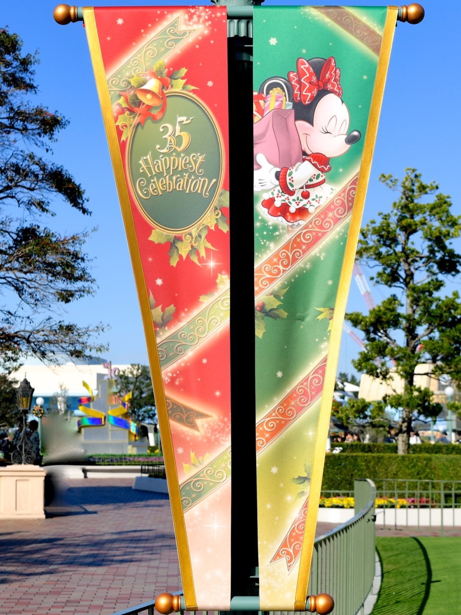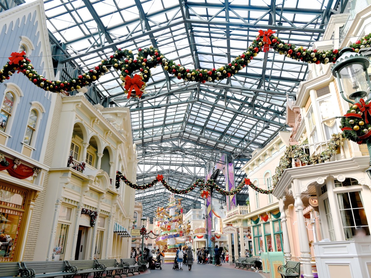 東京ディズニーリゾート35周年“Happiest Celabration!"の飾り付けがされているワールドバザール内もクリスマスカラーに!