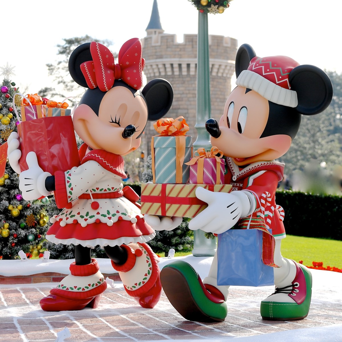 クリスマスのプレゼントを抱えているミッキー&ミニー。