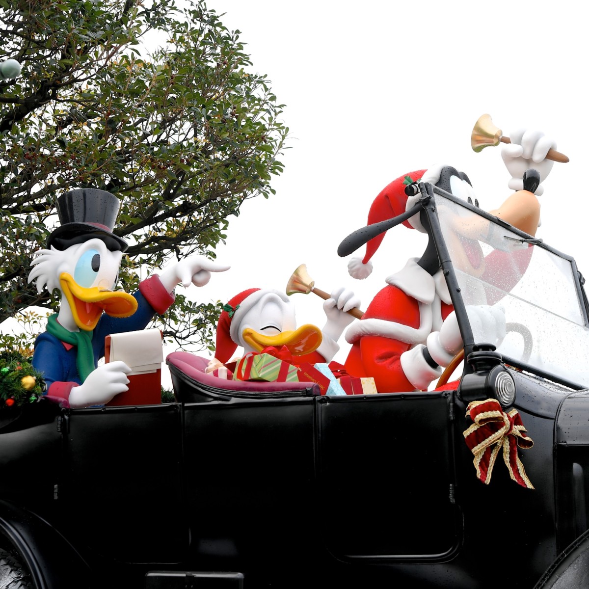 グーフィー、ドナルドがサンタコスチュームでスクルージと一緒に車に乗っています。