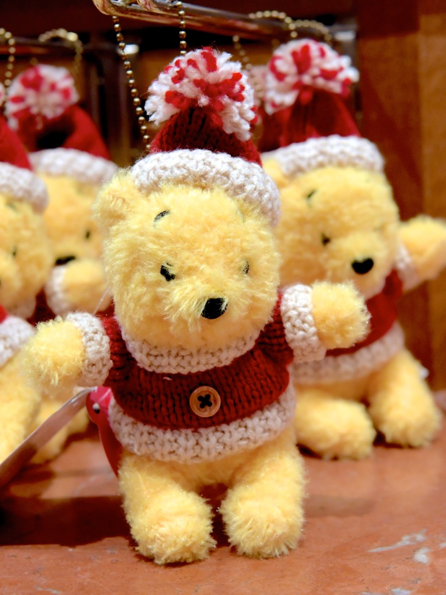 ディズニー・クリスマス期間限定グッズの定番、くまのプーさんのぬいぐるみとぬいぐるみバッジ。