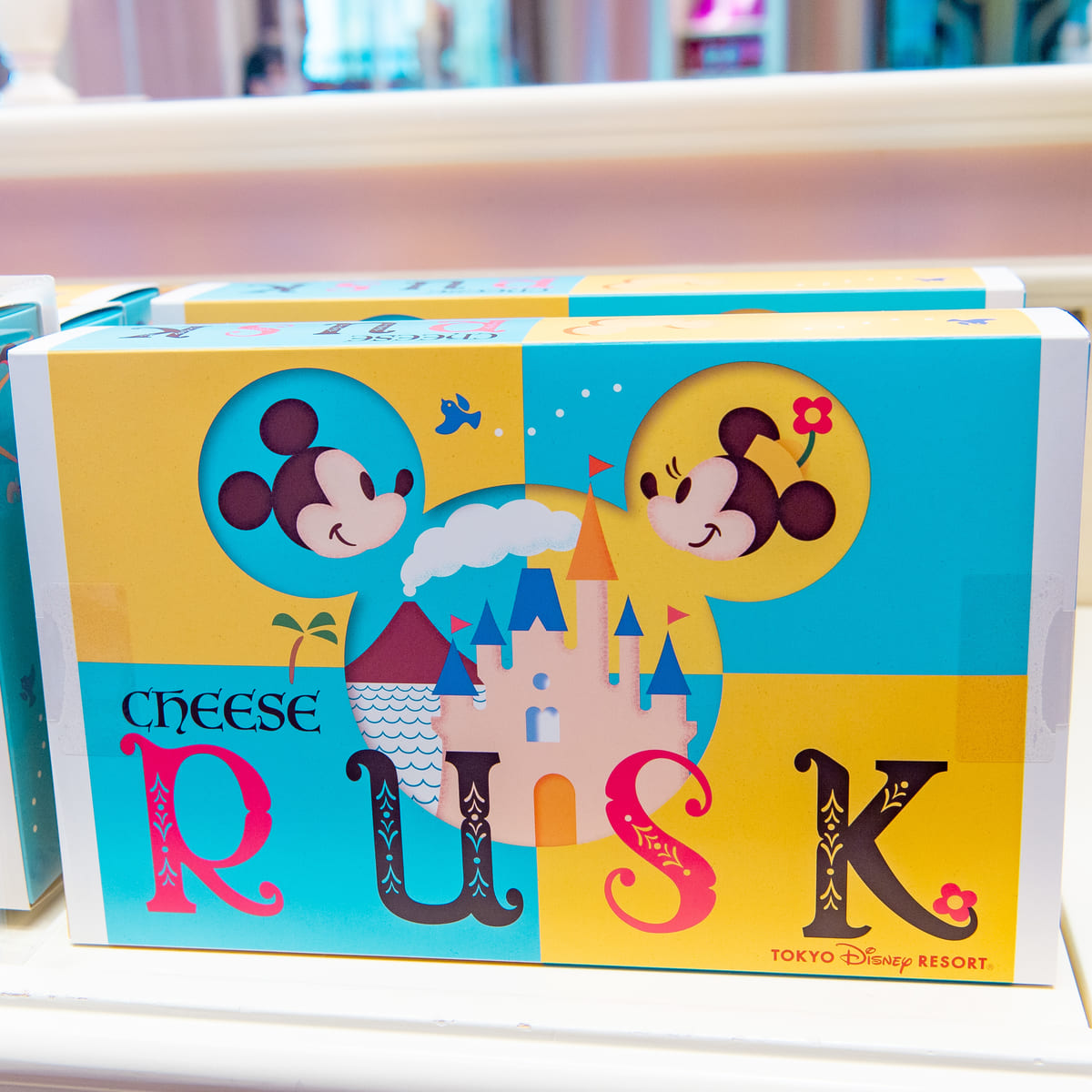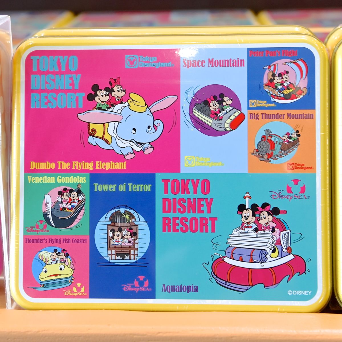 ミッキーマウスとミニーマウスが東京ディズニーリゾートのアトラクションにのって楽しむ様子がデザインされたレトロなチョコレートのお土産。