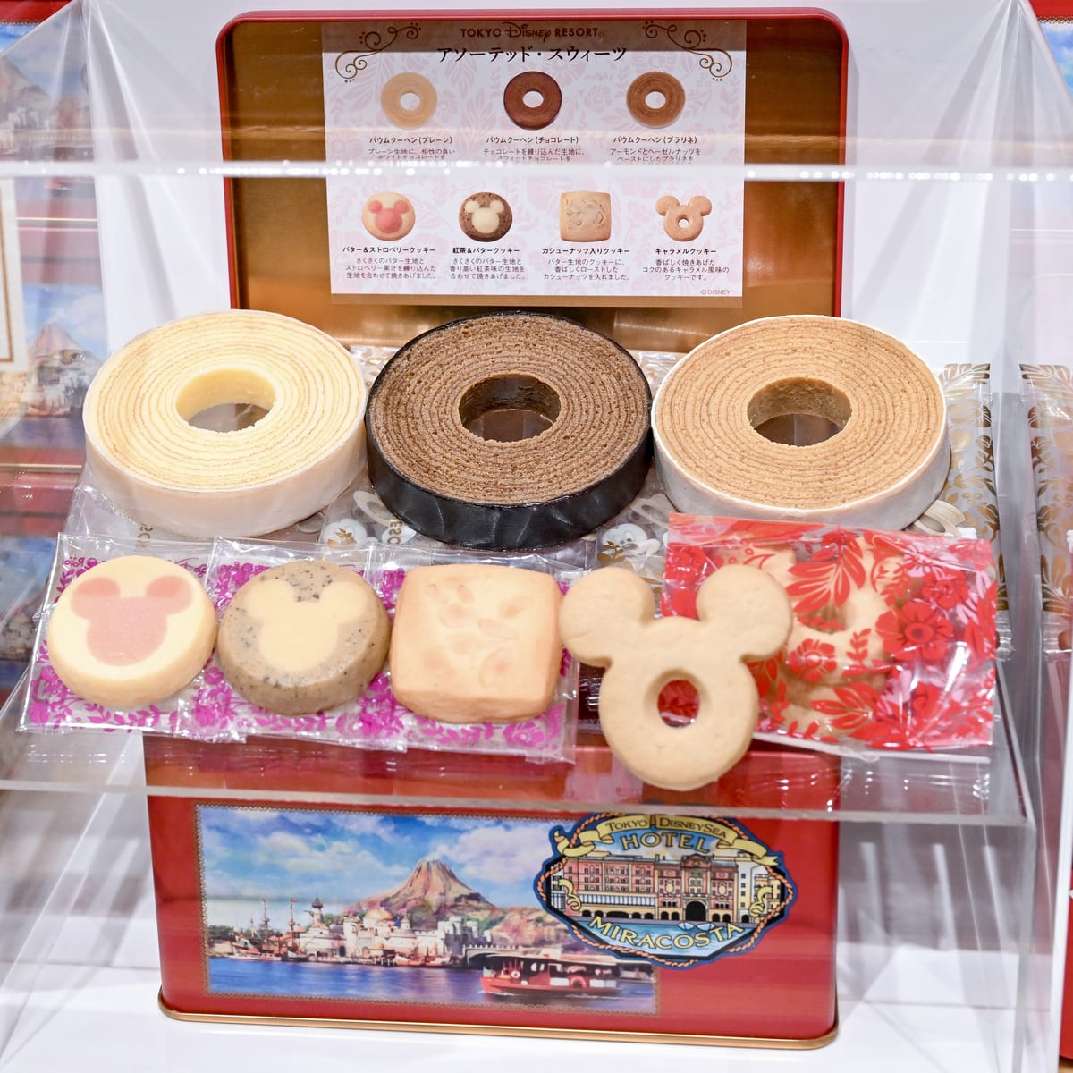 東京ディズニーリゾートの風景とミッキーマウス、ミニーマウス、蝶々がデザインされたオシャレな缶入りのスイーツ詰め合わせ。