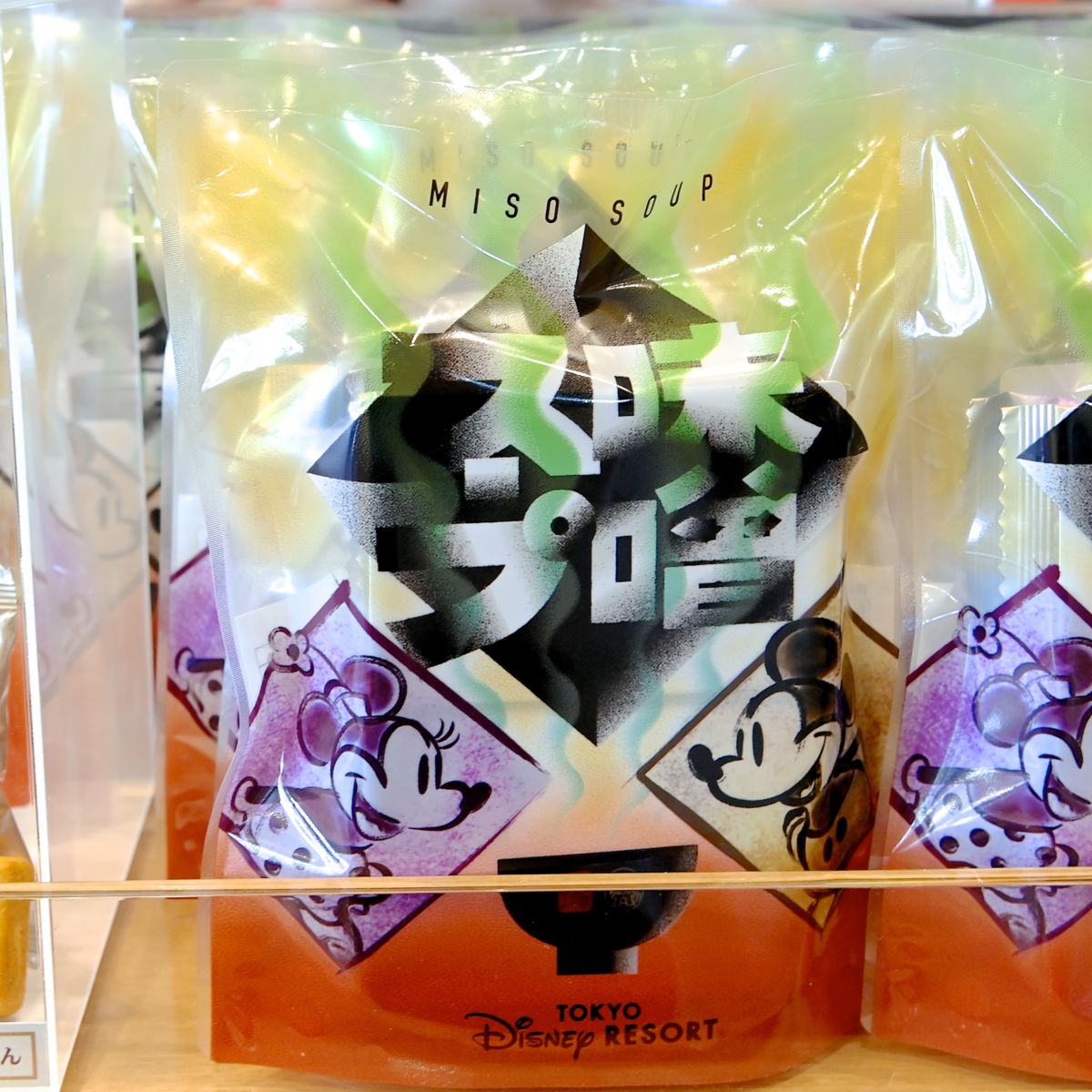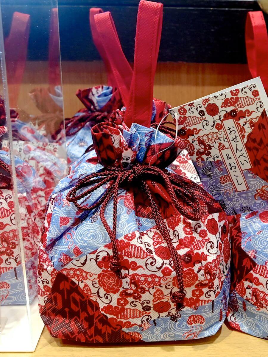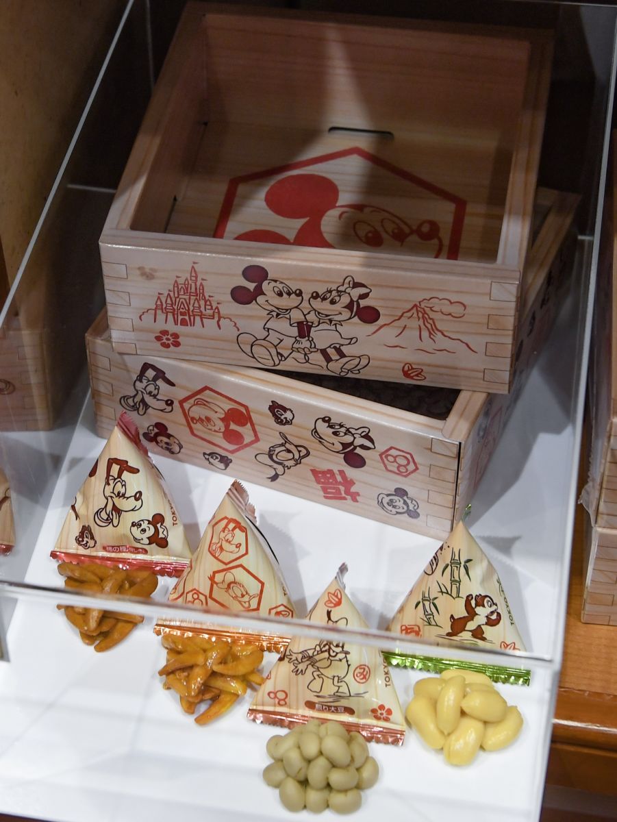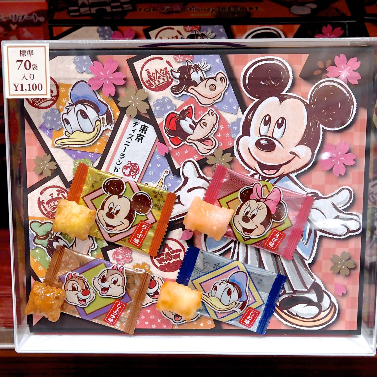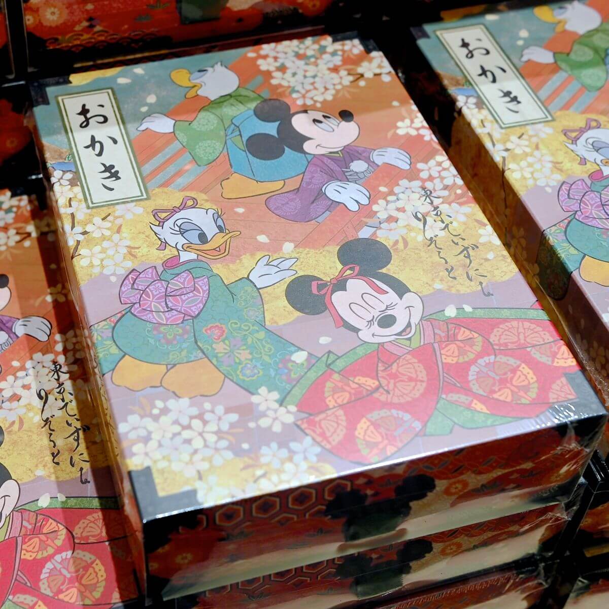 和装のミッキーマウス、ミニーマウス、ドナルドダック、デイジーダックがデザインされたおかきのお土産。