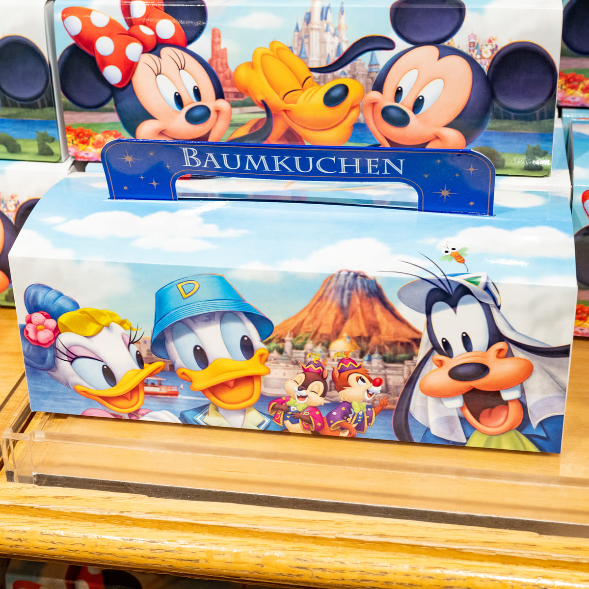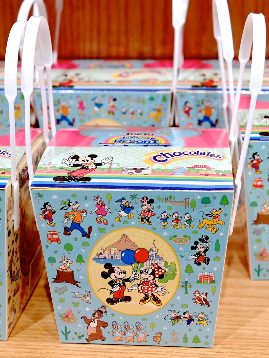 ミッキー&フレンズ、パークの風景があざやかにデザインされたパッケージ入りのチョコレート。