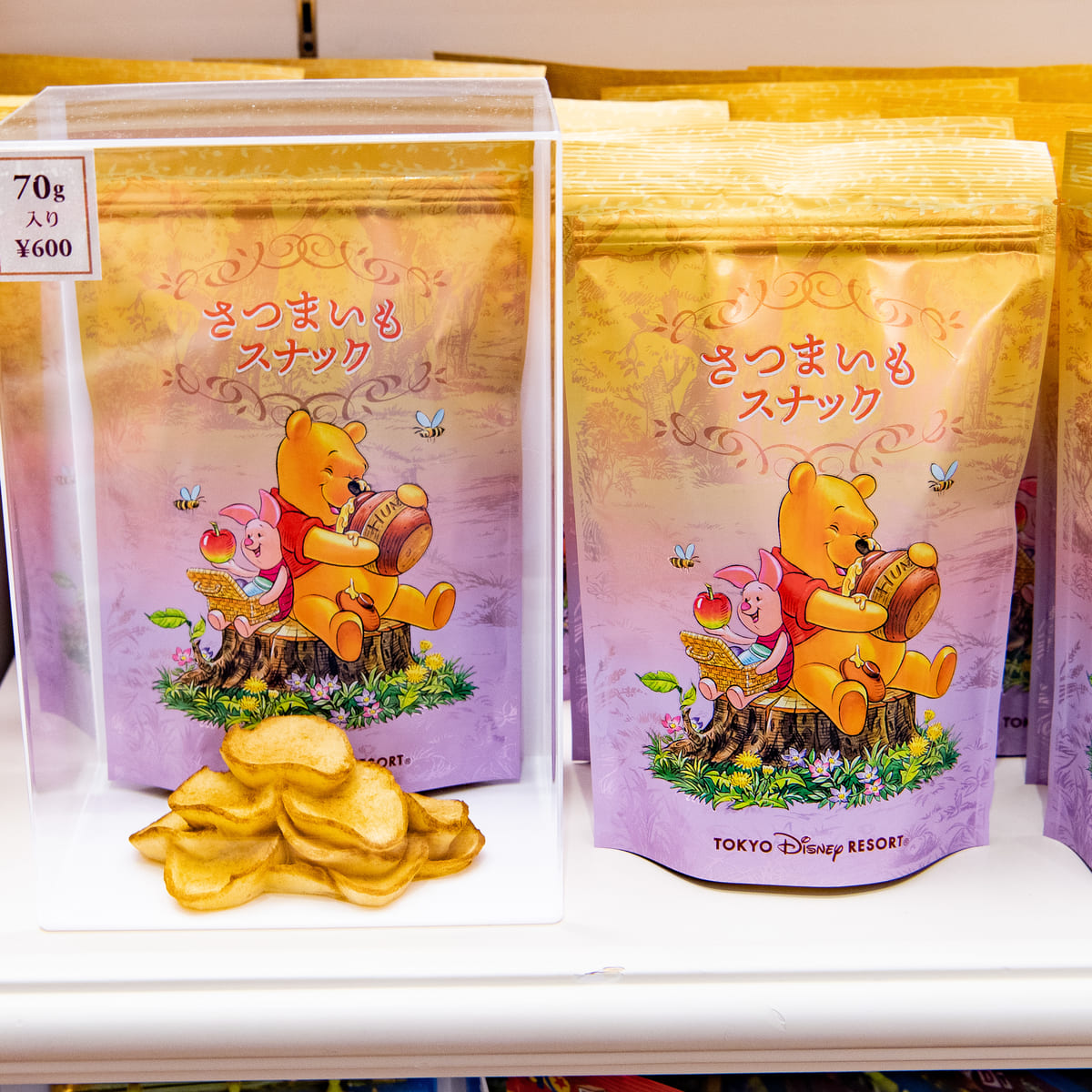 切り株に座ってはちみつを食べるくまのプーさんとピグレットがデザインされたさつまいもスナック。