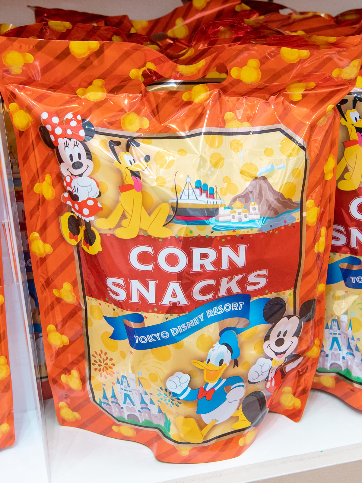 東京ディズニーリゾートを背景にミッキー、ミニー、チップ&デールがデザインされたパッケージ入りのコーンスナック。