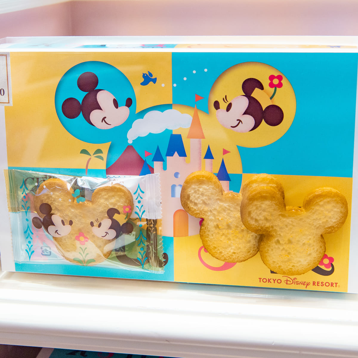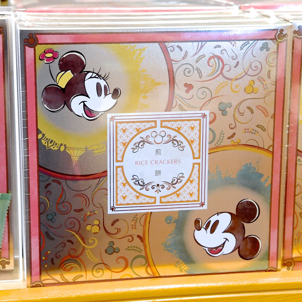 クラシックなミッキーマウス、ミニーマウスがデザインされたおせんべいのお土産。