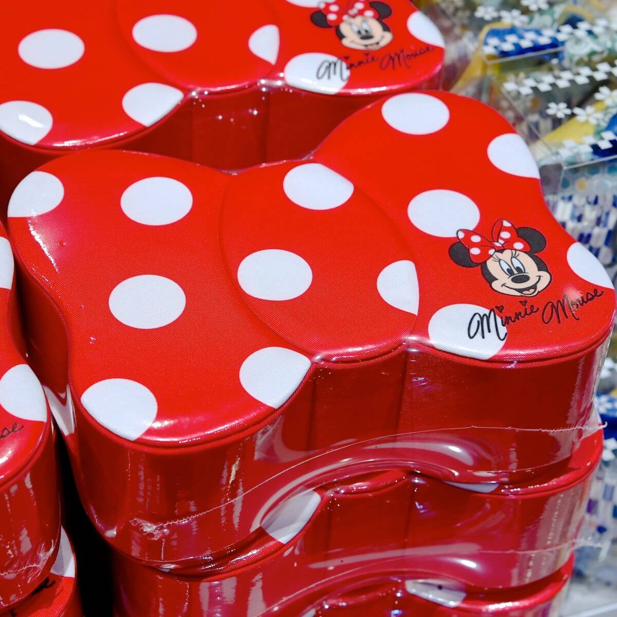 赤に白のドット柄ボックスには、「ミニーマウス」のお顔もデザインされています。