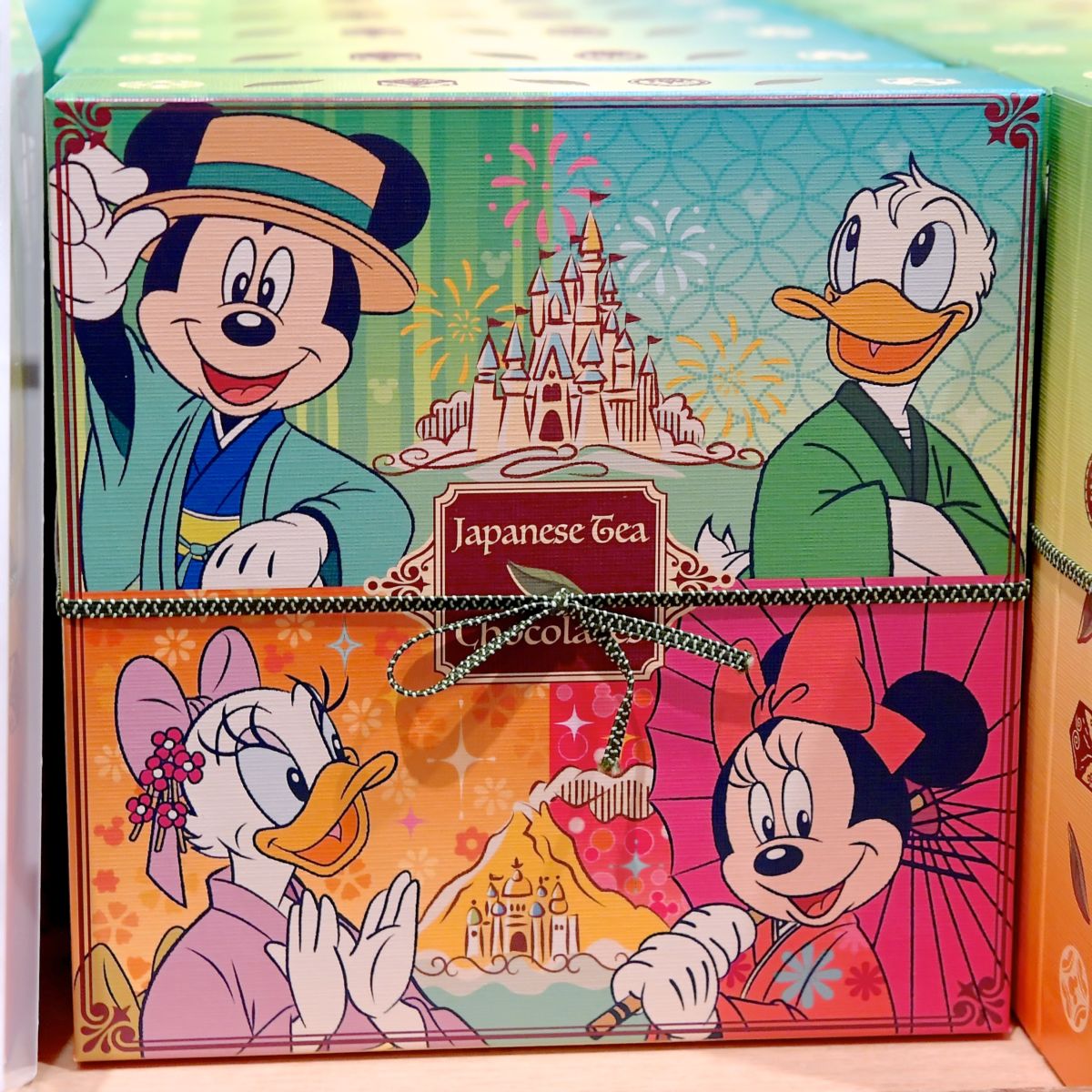 東京ディズニーランドのシンデレラ城、東京ディズニーシーのプロメテウス火山を中心に和装のミッキーマウス、ミニーマウス、ドナルドダック、デイジーダックがデザインされたカラフルなボックス入りの和風ティーチョコレートのお土産。