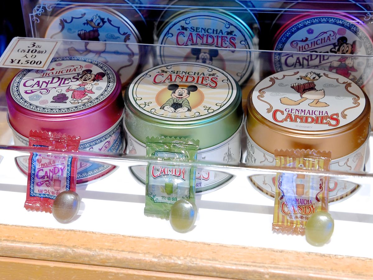 和装のミッキーマウス、ミニーマウス、ドナルドダックがデザインされたカラフルな缶入りのキャンディー。
