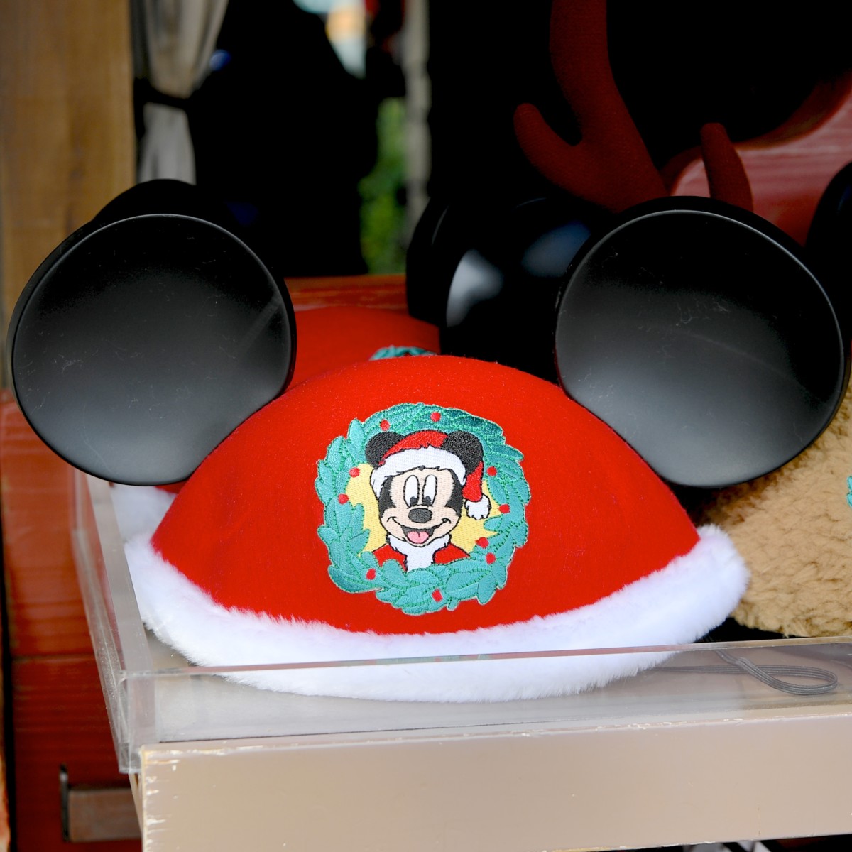 サンタコスチュームを着たミッキーがデザインされたクリスマスカラーのミッキーイヤーハット。
