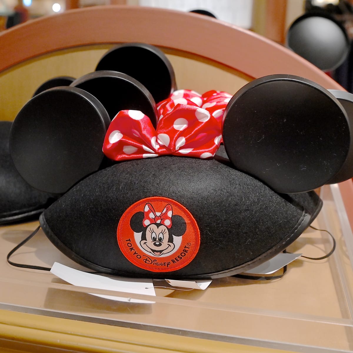 ドット柄のリボンがついたミニーマウスデザインのイヤーハット。